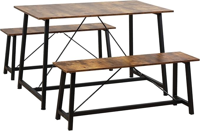 HOMCOM Industrial 3-Piece Dining Table Set, Rectangular Kitchen Table and Chairs for 4 People, Space-Saving Dinner Table with Two Benches, Rustic Brown
