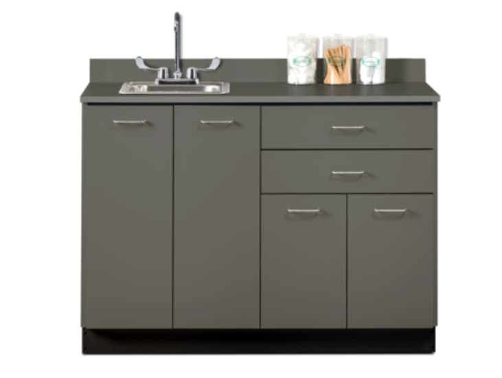 Base cabinet with 4 doors, 2 drawers and 2 adjustable shelves. Easy-clean, all laminate surfaces. Tough, chip resistant edges. Unit is pre-assembled to save installation time. Fully adjustable, soft-close hinges. 3.25" backsplash included with top. Smooth glide drawers with one-piece metal sides hold up to 75 lbs. Relocate doors and drawers to accommodate optional sink (Choose left or right sink location). Satin finish pulls. Choice of solid or woodgrain laminates. Customizable with options.