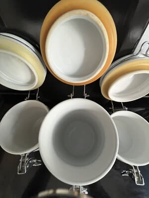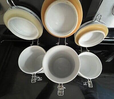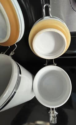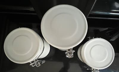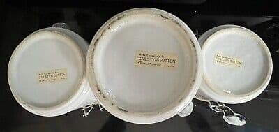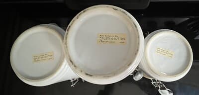 This elegant canister set made exclusively for Gailstyn Sutton by the Towle Company includes three sealed jars, perfect for storing your kitchen essentials. The classic cylinder shape and crisp white color make them a timeless addition to any kitchen decor. Jars measures 7, 5.25 and 4 inches in height and 4 inches in width, providing ample storage space for items like flour, sugar, and coffee beans. The set is in excellent condition and ready to be a functional and stylish addition to your home.