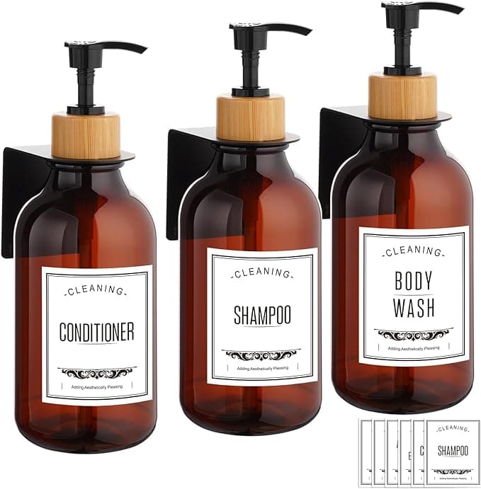 CRROEL Dispenser per sapone e sapone, 3 pezzi, 500 ml, dispenser di sapone e balsamo, senza trapano, con 6 etichette impermeabili e 3 bottiglie di sapone da bagno a parete