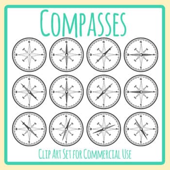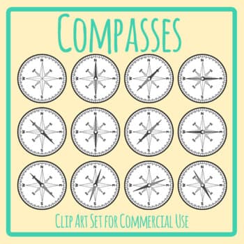 Directional Compass Clipart Set - 13 pieces of clip art in a pack or bundle for your worksheets or educational resources. All images or pictures are high resolution so you can have large illustrations of them and they'll still be clean and beautiful. Images are in PNG format with a transparent background.