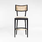 Mixed materials refresh the retro roots of our Libby counter stool. Solid nettlewood with an ebony finish shapes the stool's clean lines and crisp angles, framing a textural inlay of natural cane on the gently curved back. A slim cushion upholstered in a linen-blend weave layers on comfort while keeping the look clean and classic. The seat removes easily from the frame for effortless cleaning of the performance fabric. Thoughtful details include a brass-finished metal kickplate that protects the wooden footrest. Perfect for high-dining tables or kitchen counters.