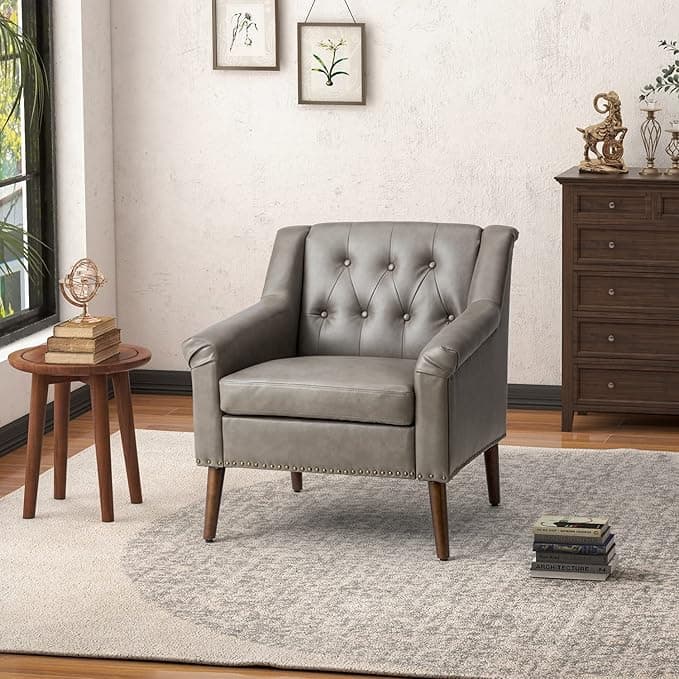 HULALA HOME Silla Decorativa de Piel sintética con Ribete de Cabeza de Clavo, sillón capitoné con cojín extraíble, sillón Tradicional para Dormitorio, Oficina, Gris