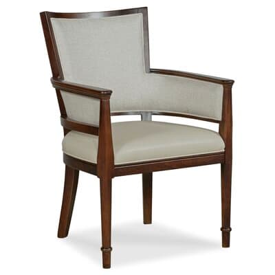 This armchair has traditional styling. Exposed wood frames the back and arms. The arms curve from the back and follow the contour of the seat. The rounded legs have banding detail.