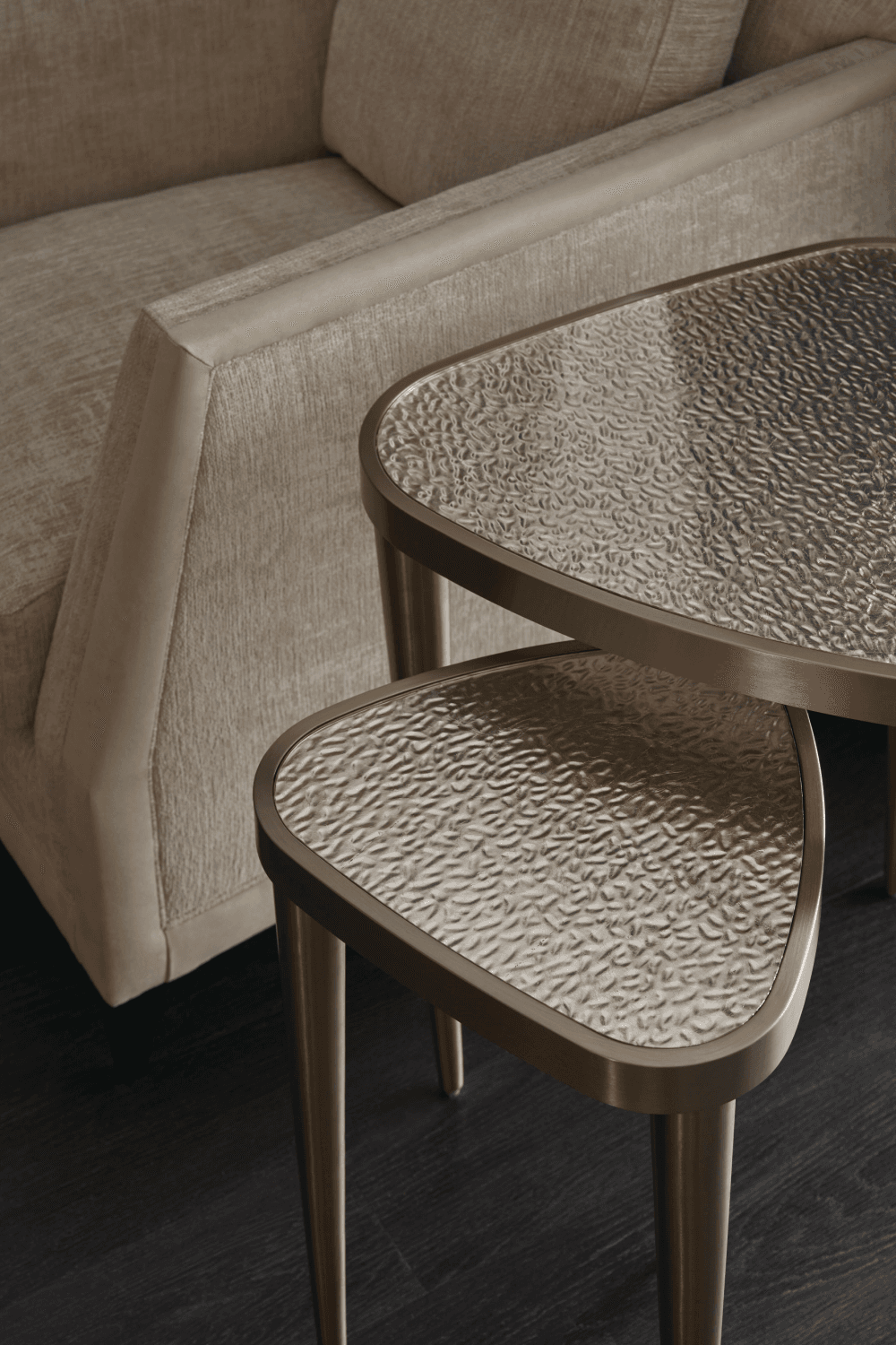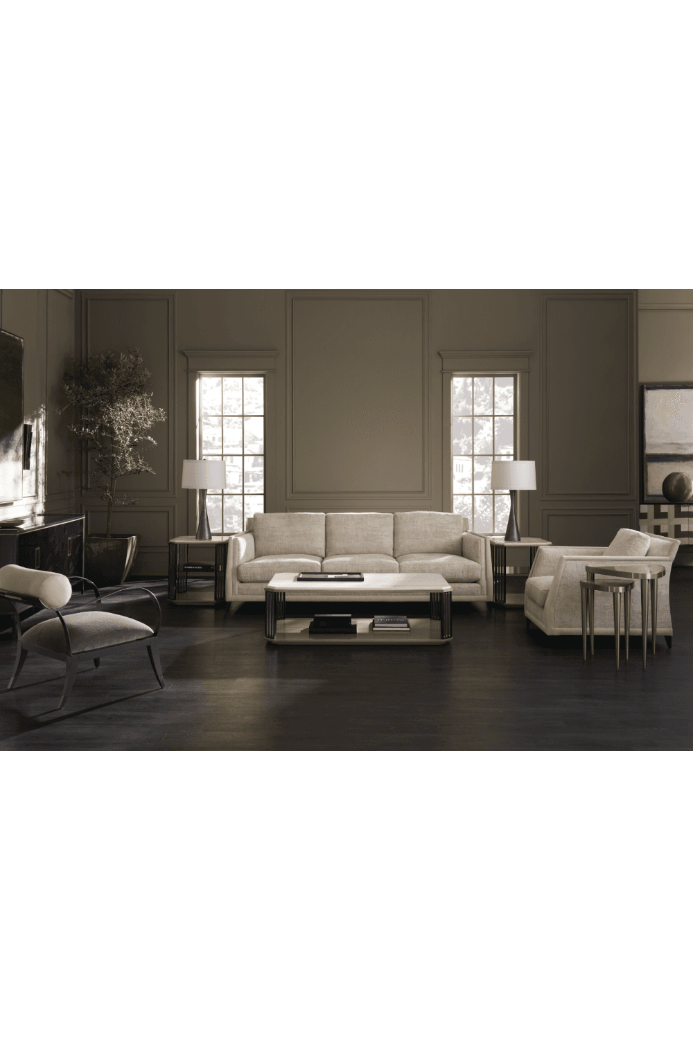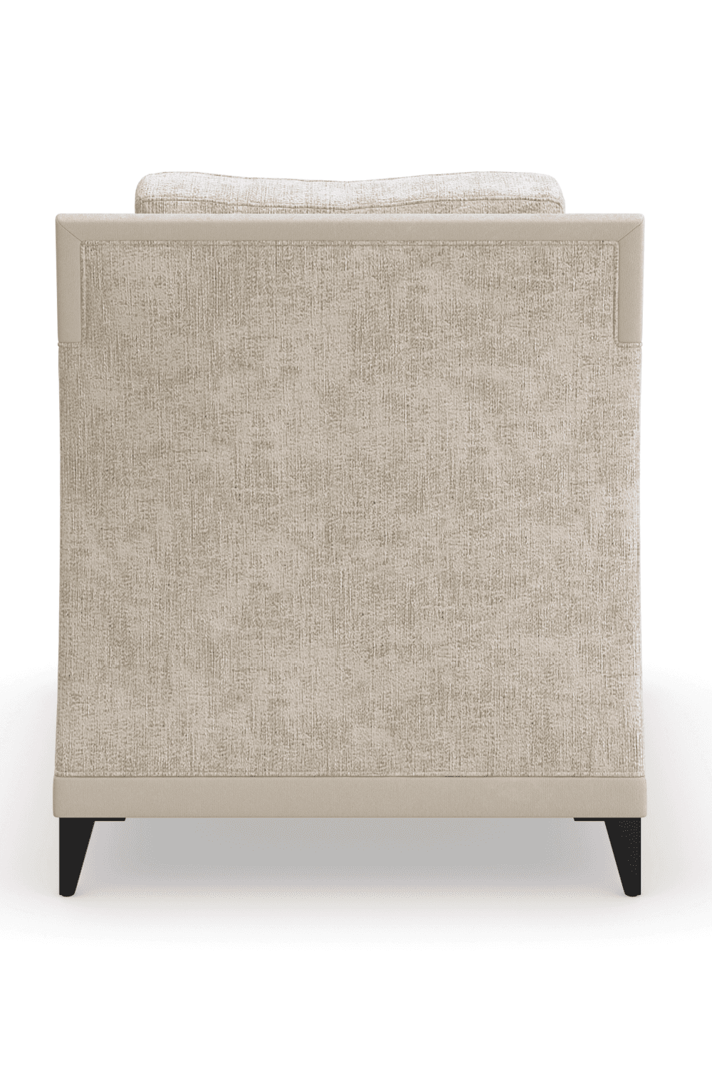 Shop this Beige Chenille Lounge Chair by Caracole. Meticulously tailored yet beautifully worn in a distressed chenille fabric, this versatile chair introduces a classic silhouette with Art Deco influences. Accentuating subtly angles and a sophisticated profile, a micro suede border lends tonal contrast and texture, warmly complemented by tapered feet in a Brushed Deep Bronze metal.