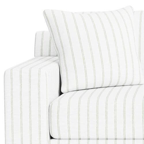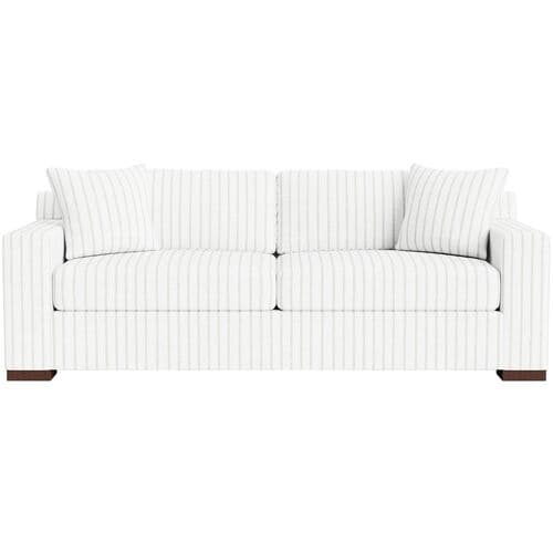 Exhibiting clear lines and ample size, the Rexford Sofa captures midcentury design for today's lifestyle. Its spacious design, featuring deep seating and thick track arms, ensures comfort with a structured cushion back. Expertly crafted in the US using kiln-dried hardwood by skilled makers, this piece is meant to be cherished for years. The upholstery is designed to be durable while maintaining its refined look. Includes two matching throw pillows. The soft linen with a double stripe offers textured comfort and a simple pattern. Additionally, the hardwood is sourced locally and sustainably, contributing to forest regrowth beyond the harvesting rate. All wood is certified for sustainability and safety, while the upholstery is enhanced with Eco Performance® for longevity in wear. The ticking, approved for fire safety, combines a mix of down feather and polyester fibers, and all components are crafted in the USA.