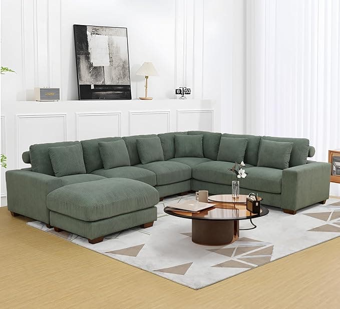 Plithzy Sofá modular de gran tamaño, sofá convertible en forma de U para sala de estar, juego de sofá de tela de pana con otomana extraíble (sofá de 7 asientos, verde)