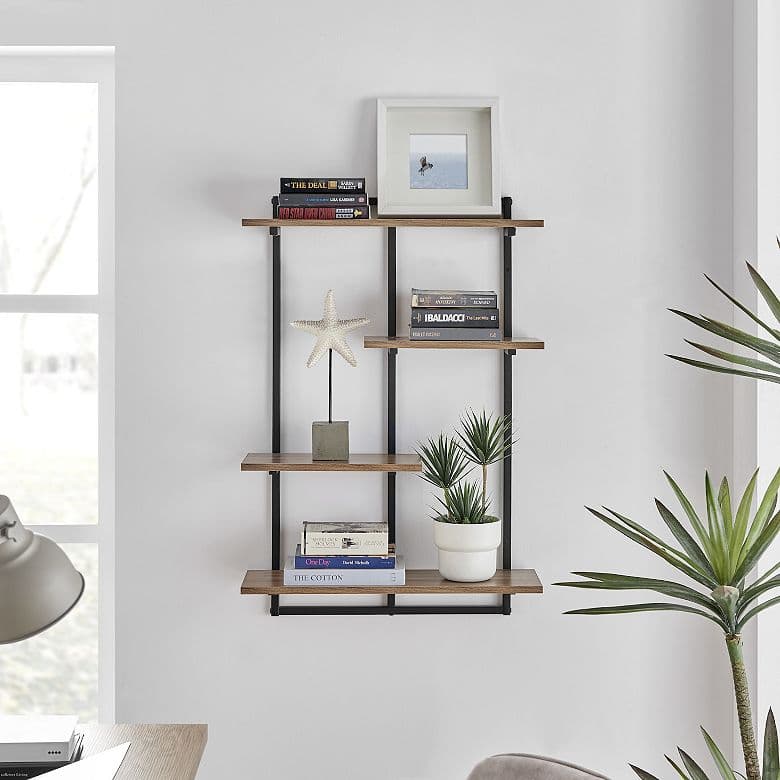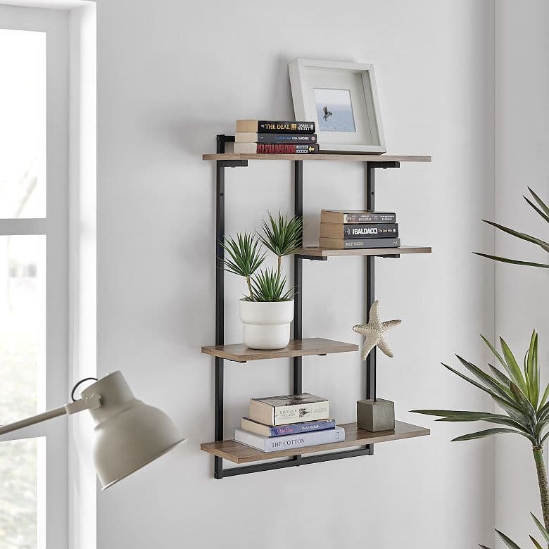 Danya B. Rhodes 4-Tier Wall Shelf Unit offers 4 sturdy, modern shelves made from MDF and metal shelving. This industrial yet classy wall mounted ladder unit features four offset shelves that offer ample storage and display space for a wide variety of décor such as books, plants, art, awards, and more. With a metal frame outlining the offset contrasting wood shelves, this shelving displays your items in a unique and urban window frame footprint. Two large platform shelves allow for traditional bookshelf usage or organization of larger items, while two small shelves encourage display of prized décor or frequently used items. Available in a variety of contrasting color combinations, this hanging bookshelf is perfect for adding storage to the walls of every room in your home without compromising your existing aesthetic and style. Elevate your home decor with the industrial yet sophisticated Danya B. Rhodes 4-Tier Wall Shelf Unit. With four sturdy shelves made from MDF and metal, this wall-mounted ladder unit provides ample storage and display space for all your favorite items. The offset design creates a unique and modern window frame effect that will draw attention to your decor. Plus, with a variety of contrasting color combinations, this hanging bookshelf will seamlessly blend in with your existing aesthetic. Use it to organize and showcase your books, plants, art, awards, and more in a way that is functional and visually appealing. Update every room in your home with this stylish storage solution!