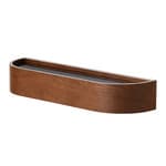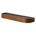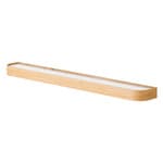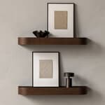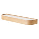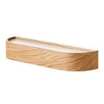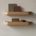 The Epoch Shelf displays a wide band of Oak Veneer perfectly curved to sit against the wall. Can be mounted two ways: it features a deep side to act as a catch all or protect larger items, and also a shallow side to display decorative objects.