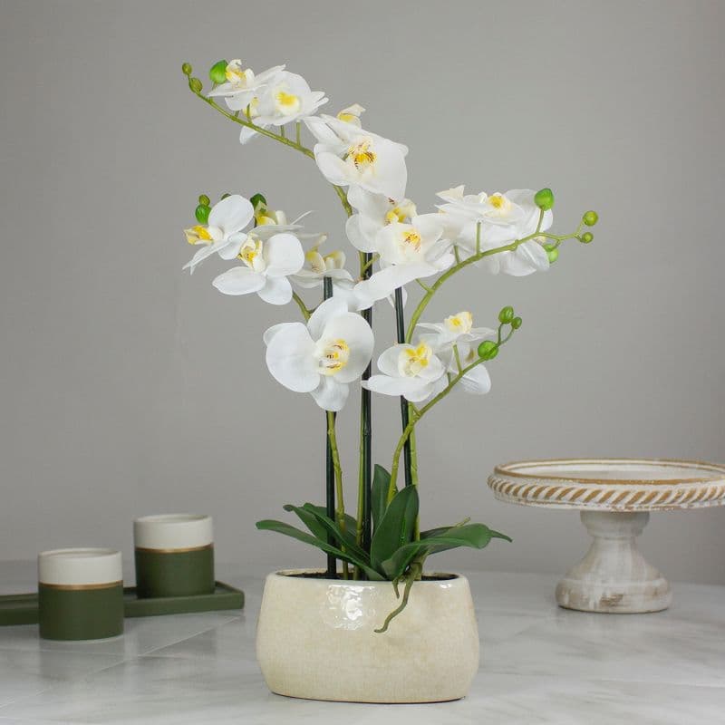 You’ll love the realistic look of this Real Touch™ orchid flower plant, part of a select group of artificial botanicals chosen for its high quality. Elegantly add some color to any space while livening it up with our artificial orchid plant. This true-to-life faux potted plant is beautifully realistic with multiple blooms. This plant will make a great addition for years to come to any space whether it be your home, office, or place of business. Product Features: Real Touch™ artificial orchid plant Features realistic-looking orchids, blooms and leaves Orchids are white with yellow buds in the center Comes in a white oval pot No assembly required Recommended for indoor use or outdoor covered use Dimensions:22'H X 8'W X 3'D Material(s):plastic/ceramic