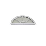 HALF-ROUND DOOR LITE SURROUND 22 X 10 X 1/2 GLASS WAGON WHEEL EXTERNAL MUNTINS. Part No: 330221023. Door Lite Frame or Sidelite Surround with Glass. Frame: Wagon wheel external grid design. Tip-to-Tip Rim Dimensions: 24 x 11-3/4. Cut out Hole: 23 X 11. Glass Size: 22 x 10. Glass Thickness: 1/2 inch. Material: Plastic. Color: White.