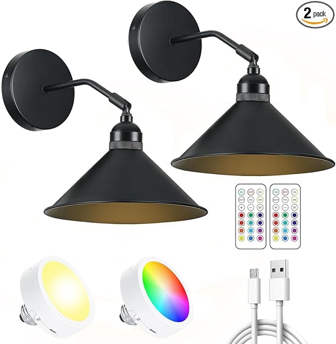 Rechargeable Battery Operated Wall Sconces Set of 2 , No Hardwired 13 Color RGB DImmable LED Wall Light with Remote,180 degrees adjustable Vintage Black Lamp Fixture for Livingroom Bedroom Gallery - Amazon.com