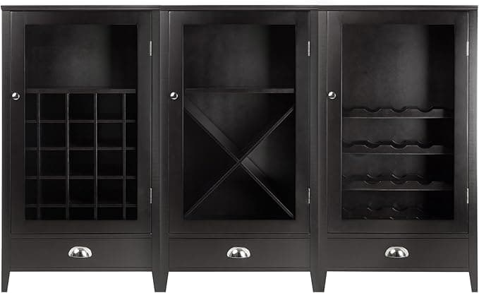 The wine enthusiasts are in for a massive surprise! They will instantly love this modular wine cabinet. Promising ample storage, you can store up to seventy bottles of wine. All together or evenly spaced, this lavish addition is perfect for your dining room, kitchen, or game room. Product Features: Includes modular wine cabinet set. Made with a combination of solid and composite wood in espresso finish. Three drawers with pull out. Unique cabinet set can be used together or separately. Use them all together or space them in the dining, kitchen or game room. Store up to 70 bottles of wine with this combination, Stemware rack and plenty of storage. Assembly required. Care instructions: wipe clean with a dry cloth. Recommended for indoor use only Overall dimensions: 40"H x 67.9"W x 15.75"D (when all three are placed together). Each unit: 40"H x 22.6"W x 15.75"D Material(s): wood/tempered glass.