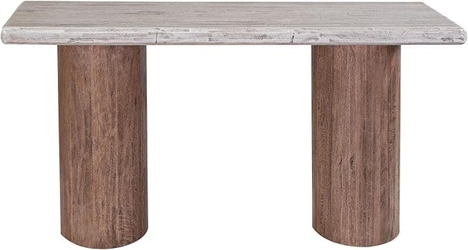 Transform your living space with our Kohl sofa table, showcasing exquisite craftsmanship. Crafted from durable mango wood, the table boasts a drum base and a floated top, creating a unique and stylish look. The brown and cream finish adds warmth, while the mortise and tenon joinery ensure lasting stability and quality. Check out our Kohl collection for matching items.
