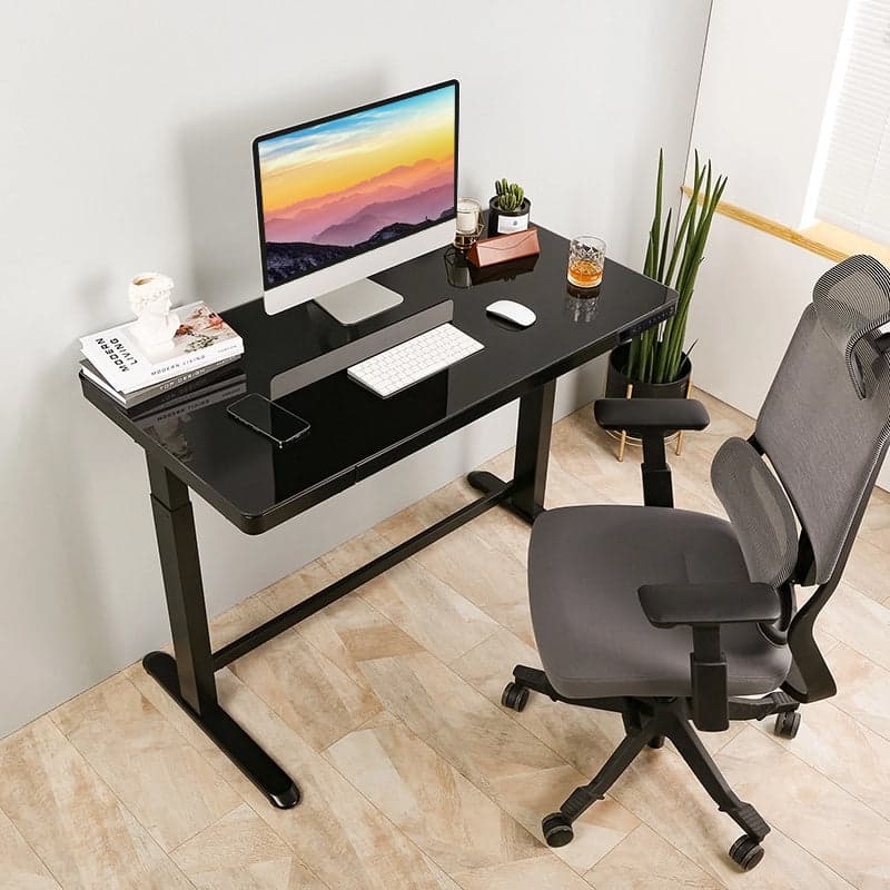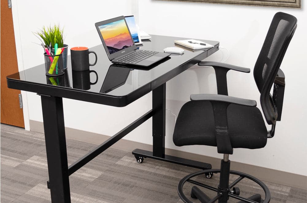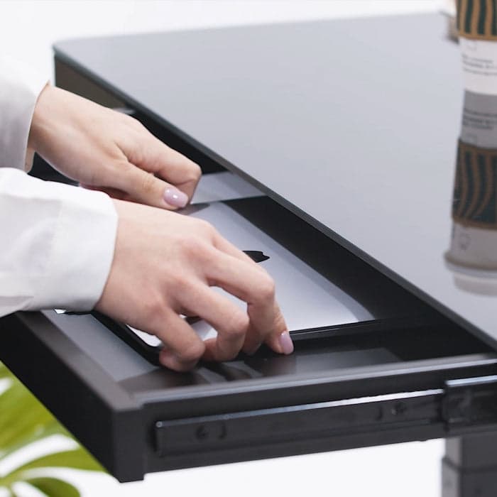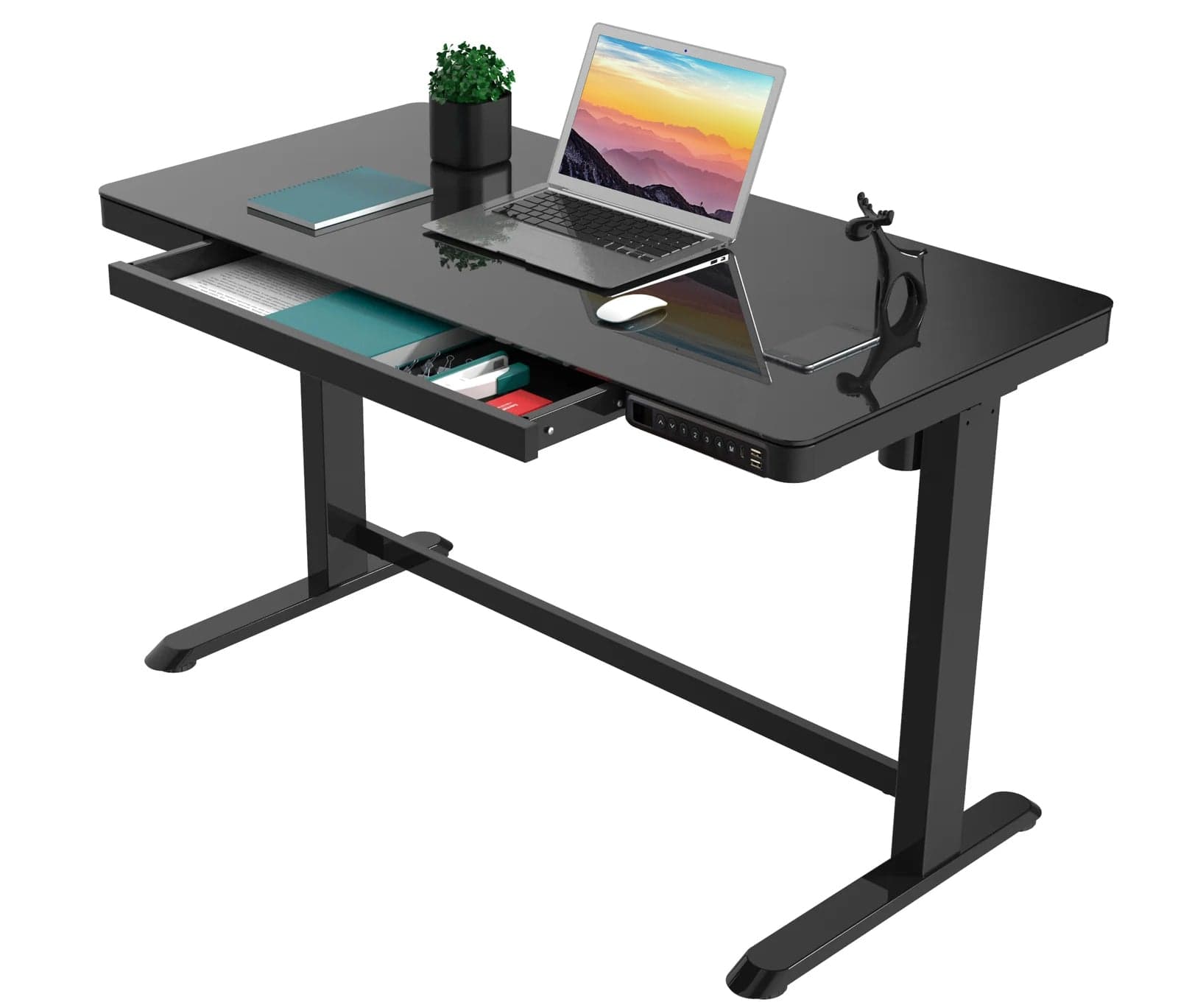 Rise Up Glass Electric Standing Desk has a quick, simple 10-minute assembly, 1xUSB-C, 2xUSB-A, 2xAC Outlets. The affordable tempered glass standing desk makes an elegant glass computer desk. This glass standing desk has a storage drawer to work clutter-free. Upgrade to an affordable glass standing desk!