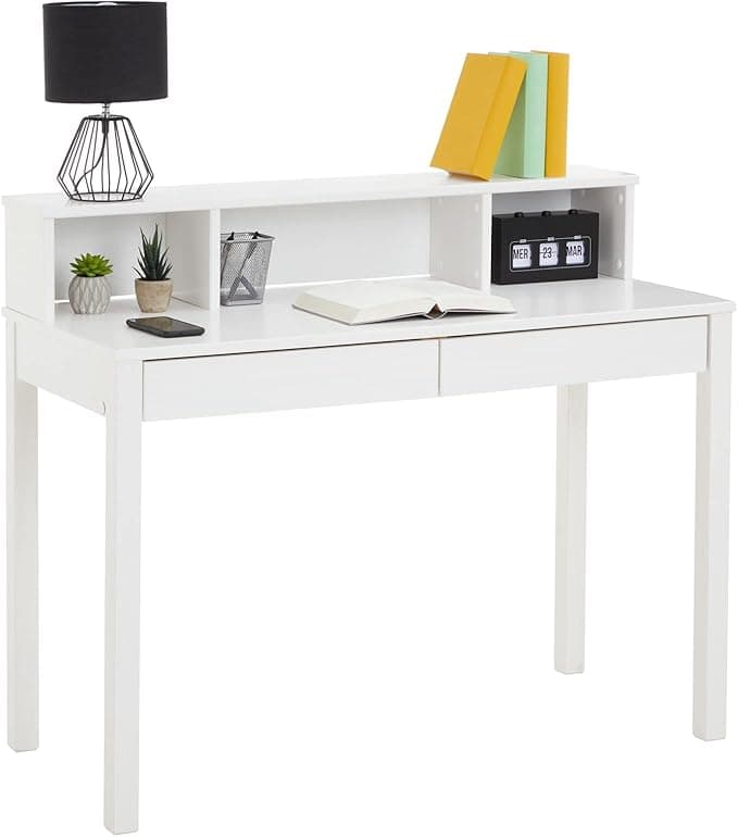 IDIMEX Lennox - Mesa de escritorio con 3 nichos, práctica mesa para ordenador con 2 cajones, atemporal de pino macizo en color blanco