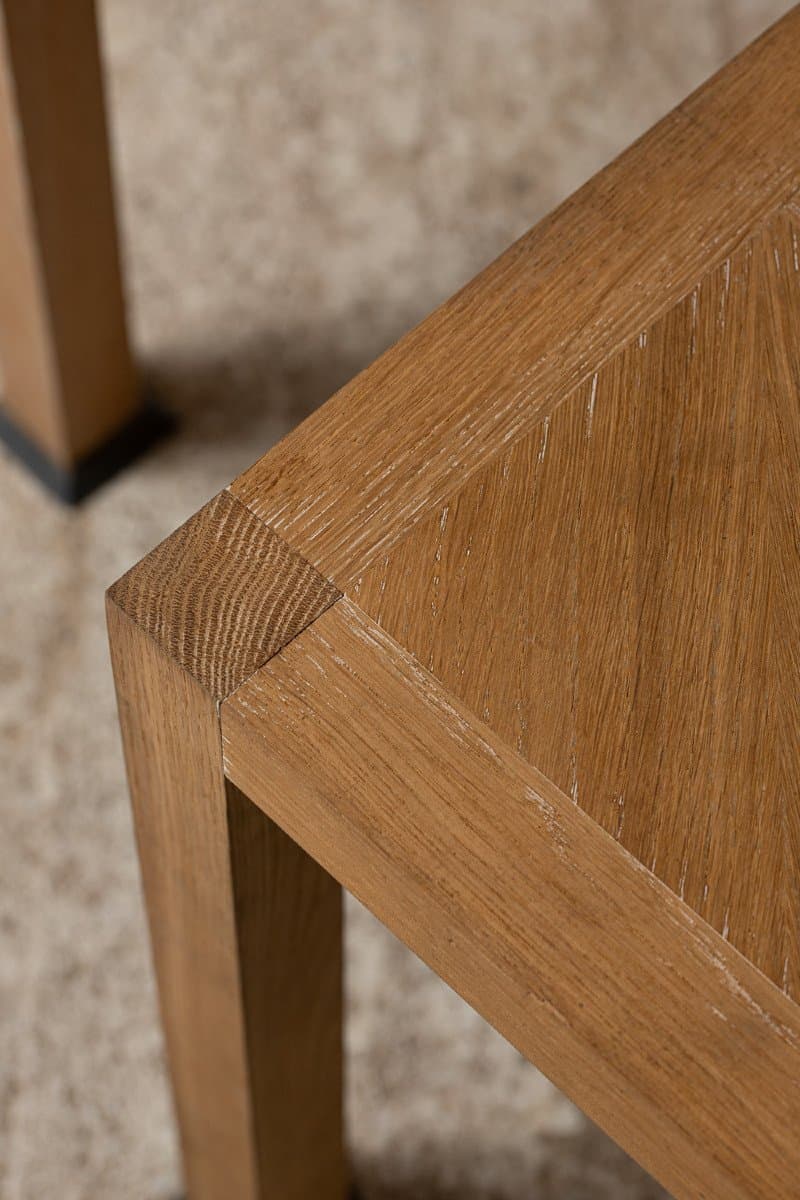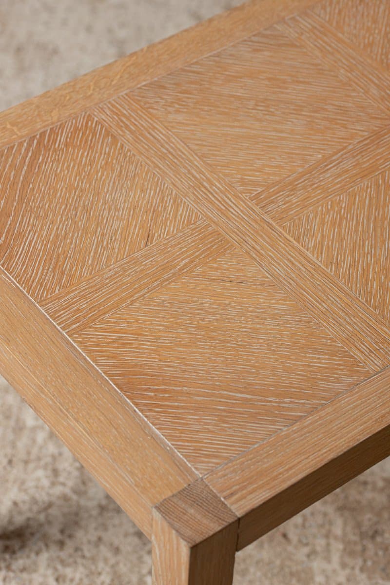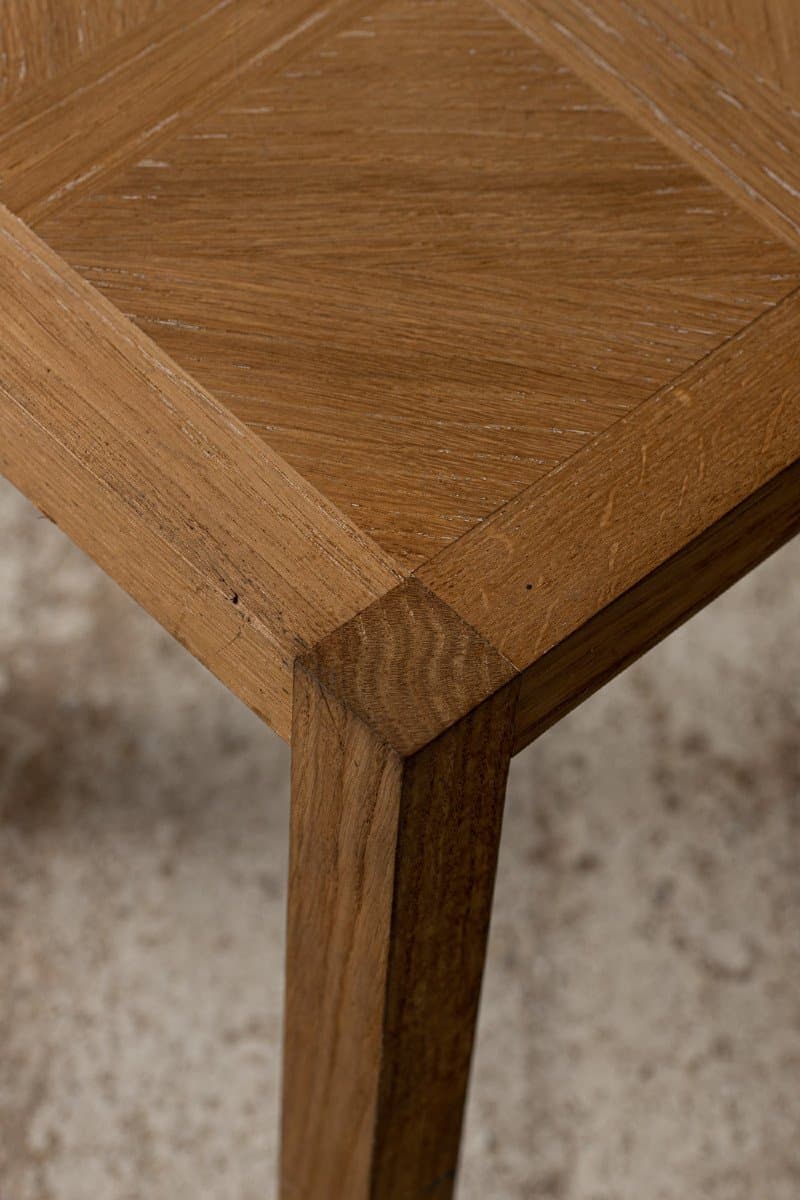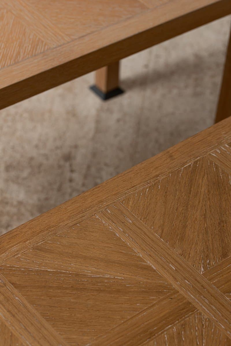 Table in natural varnished oak, top in marquetry, clogs in tinted resin.