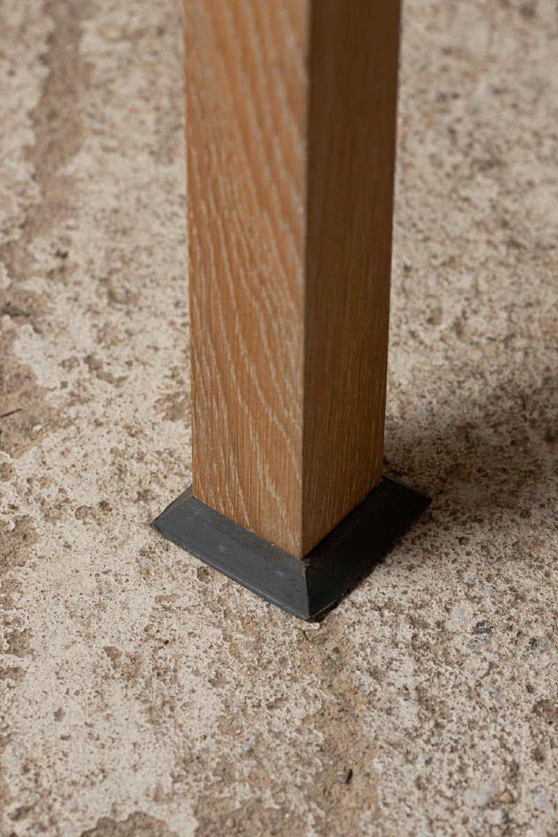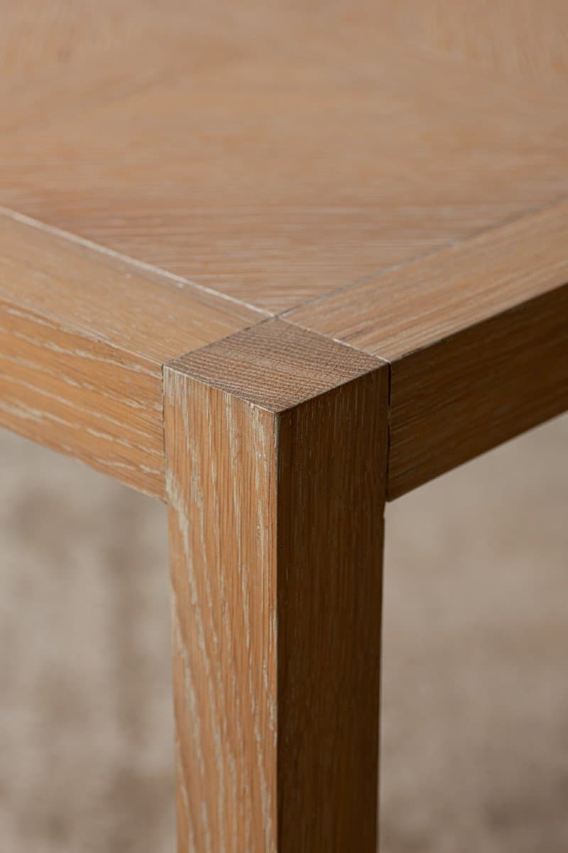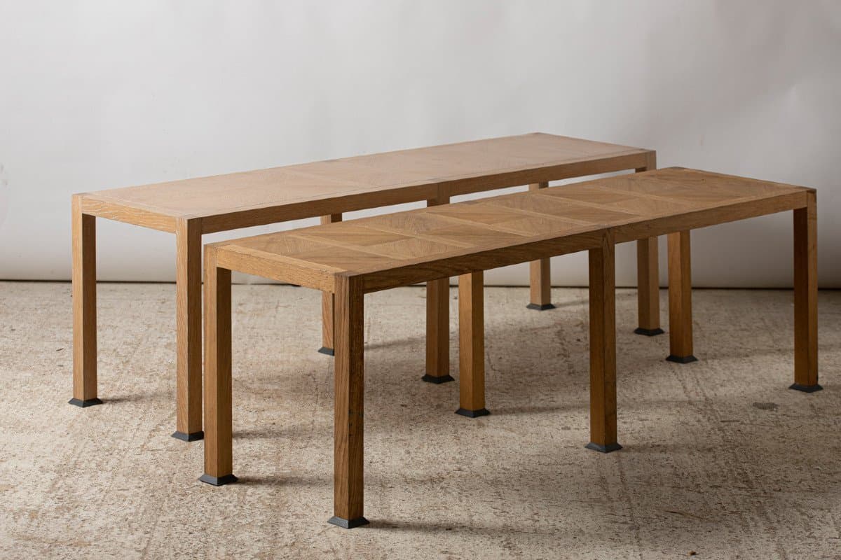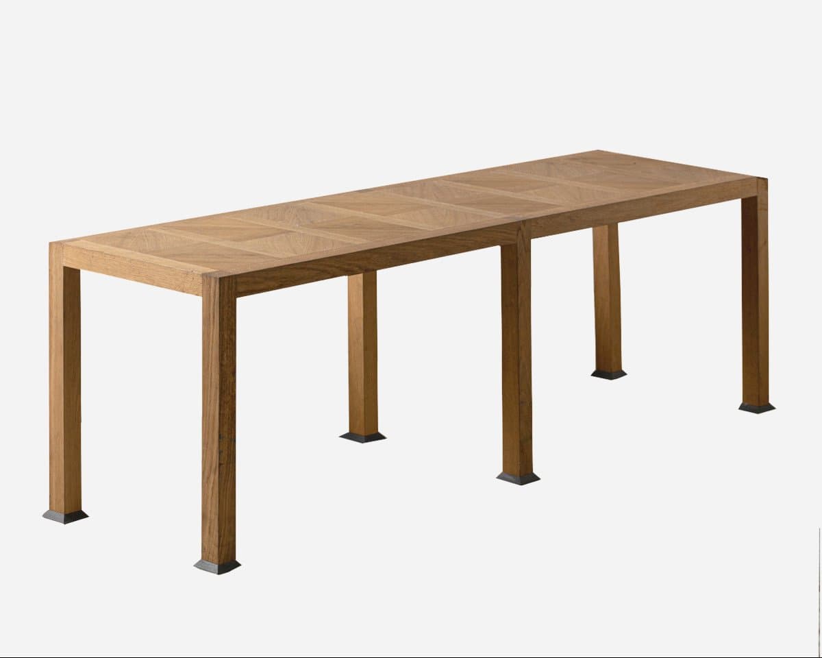 Table in natural varnished oak, top in marquetry, clogs in tinted resin.