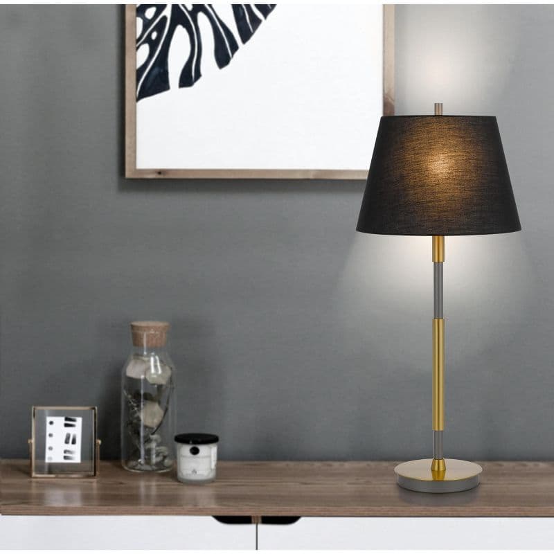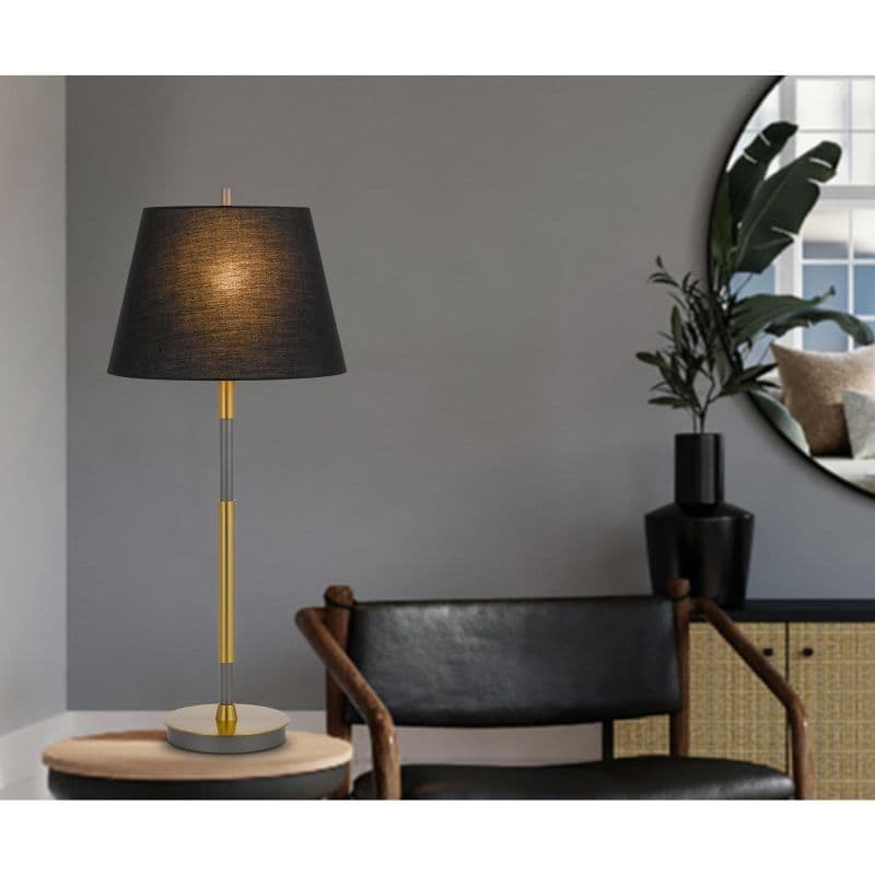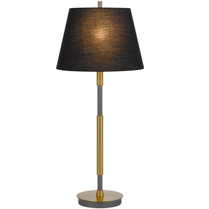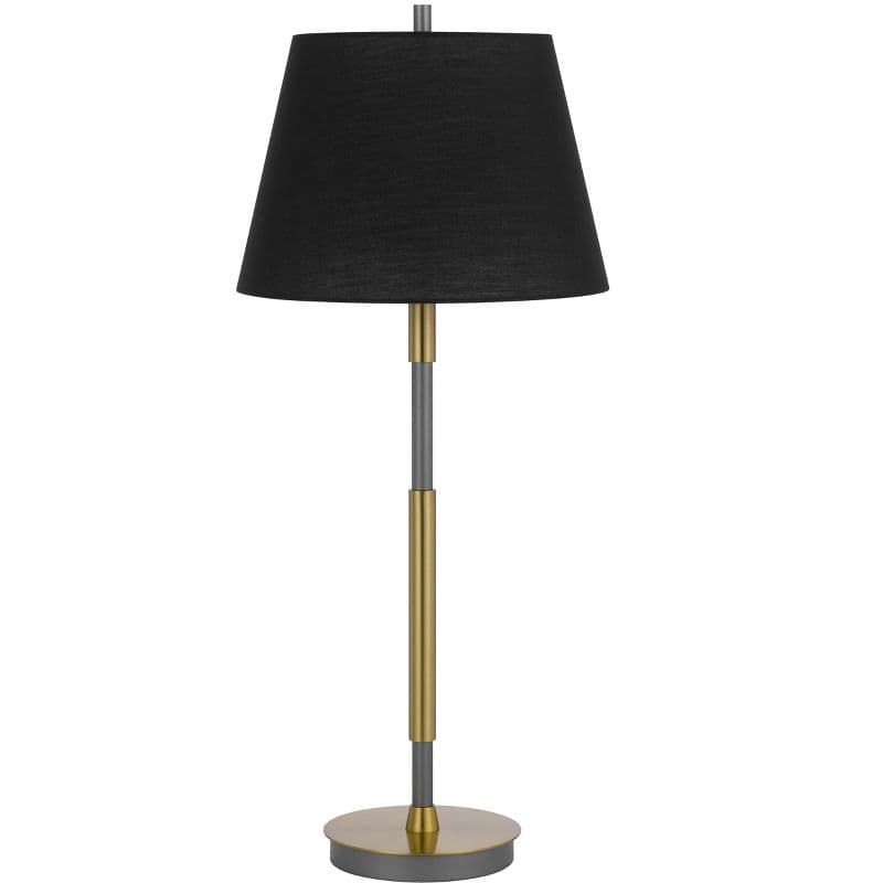 Add a classy touch to your décor with this elegant two tone table lamp in dark silver grey finish with a contrasting antique brass accent color. The lamp ships complete with a matching black shade and metal finial.