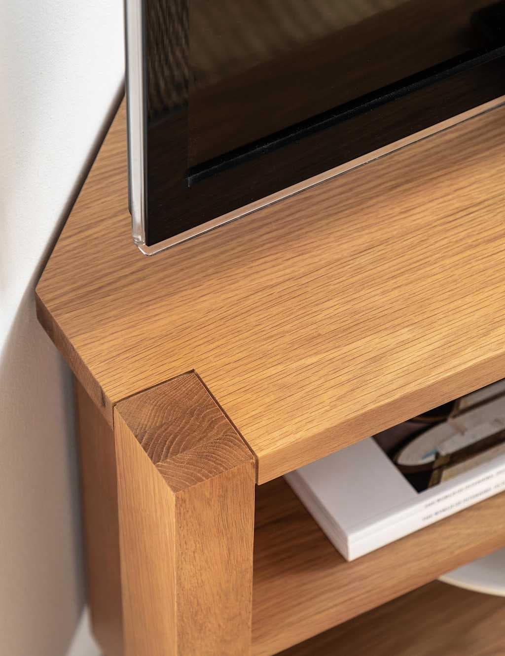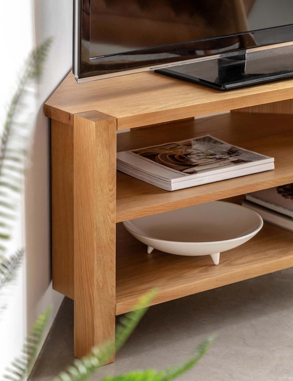 Fitting neatly into any living room, this Sonoma™ corner media unit is a great way to organise your TV and electronics without compromising on space. With ample surface space and one adjustable shelf, this wooden media unit has plenty of room for you to neatly tuck away your TV, games consoles or any other electronics. We’ve built this piece from predominately solid oak and oak veneer for a classic feel, while a low-sheen lacquer adds much-needed protection from the inevitable scuffs and scratches of everyday life. Includes 1 Year Guarantee.