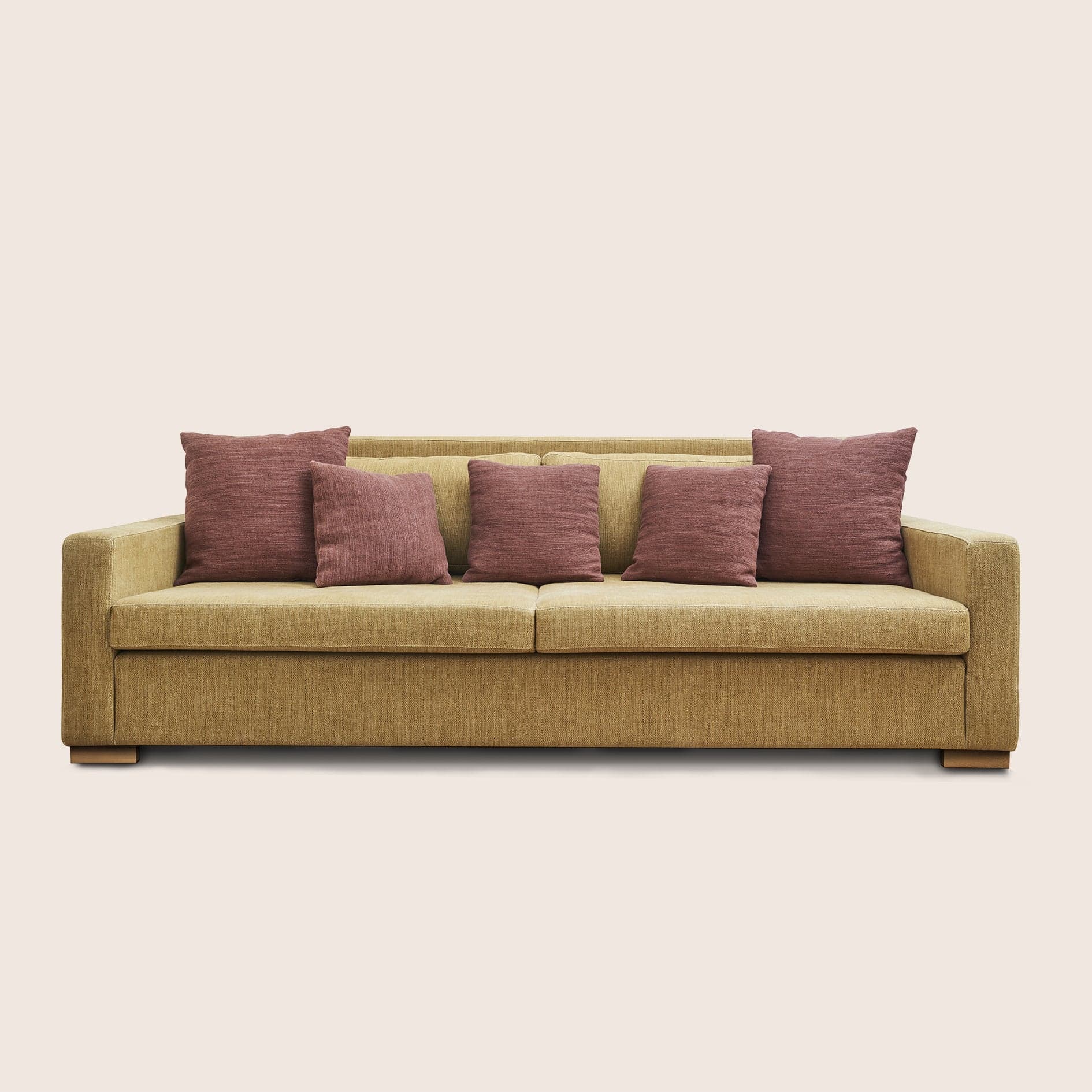 With its classic chic look and clean lines, the Namibia sofa only offers you the possibility of relaxing. You will appreciate its padded linen seat and cushions. Material: coarse ocher linen and cushion in rust coarse linen Dimensions: W 215 x D 110 x H 75.5 cm — feet 5cm high Delivery times (excluding stock): 10 weeks