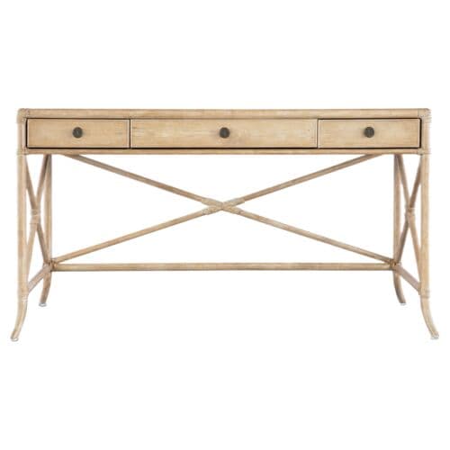 With the sublime vibe of an island oasis, the Retreat Writing Desk is crafted of Oak and Maple Veneers in a Bamboo motif and accented by rope. X-design stretchers on the back and sides distinguish the piece, with a finish that is transparent by design to showcase the unique patterns of the wood veneer. Featuring three drawers, the left and right drawers have two removable dividers. One pencil tray and one writing slide may be used on either side, and the center drawer has a drop-front for keyboard use. Finished on all sides.