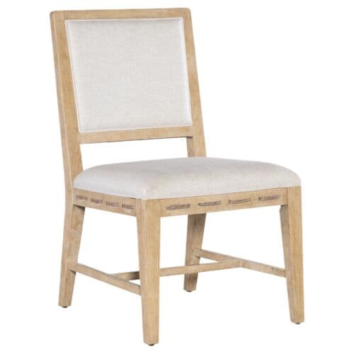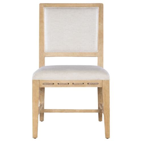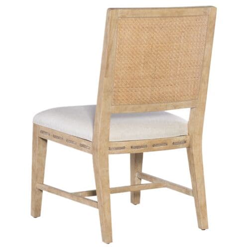 Island Oasis meets Organic Modern in the Retreat Raffia-Back Side Chair. In a mixture of natural materials including wood, raffia cane, rope, and fabric, the chair is comfy and chic. The seat and back of the chair are upholstered in a neutral performance fabric, and the seat apron features rope trim. The back of the chair is covered in raffia cane, and the chair frame, stretcher, and legs are finished in a sand-colored tone, transparent by design to reveal the unique grain patterns of the veneer.
