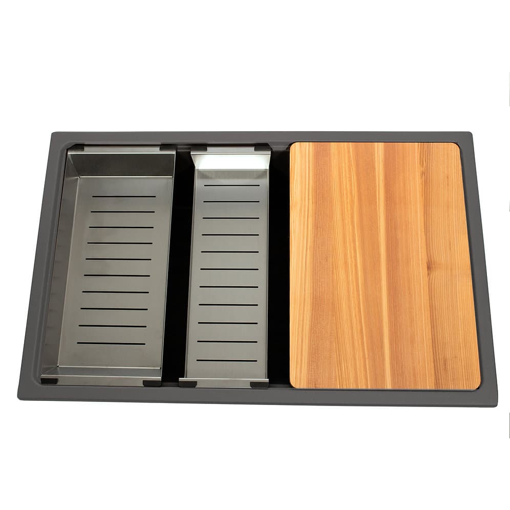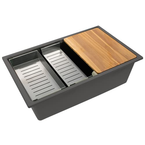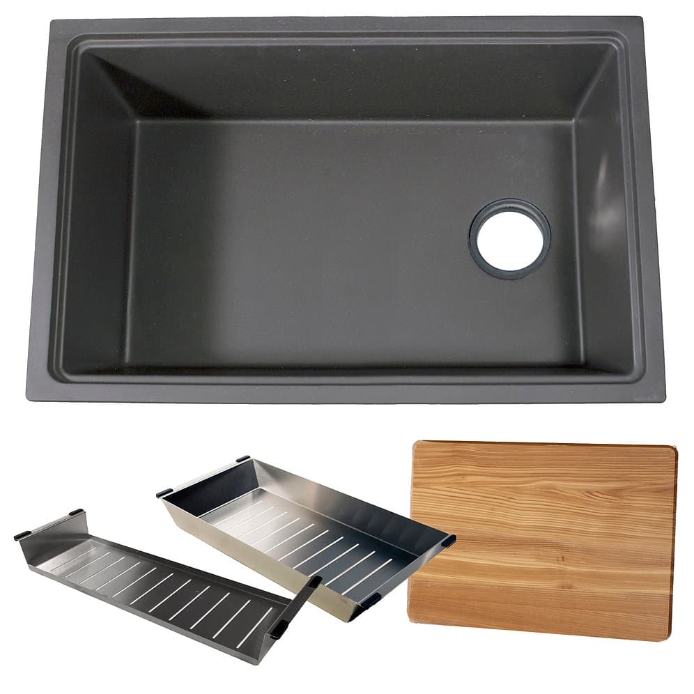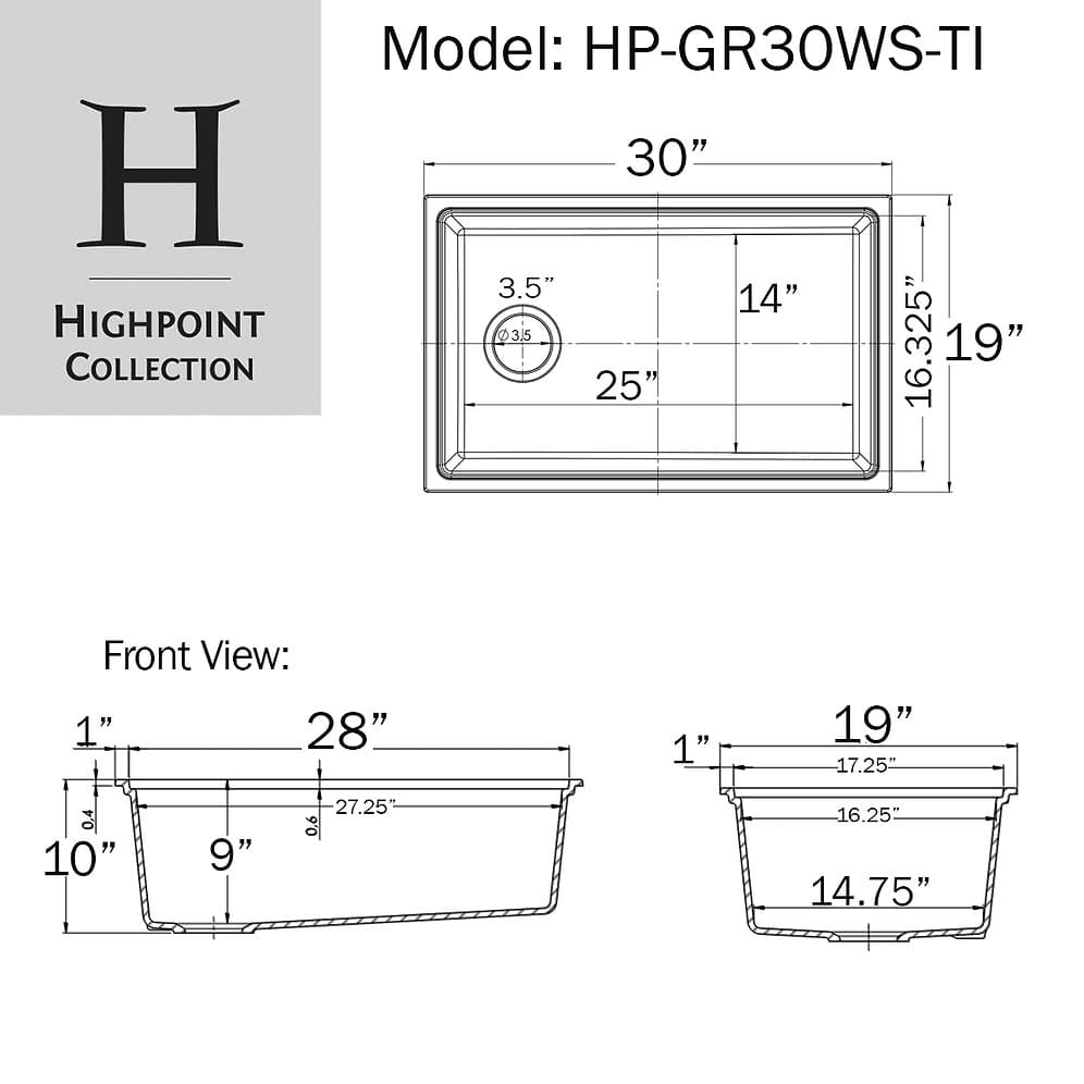 Highpoint Collection's 30 inch dualmount workstation granite composite sink comes with a cutting-board and colander. The design features a built in ledge for holding the included accessories or a cutting board, rinse tray, and colander. It can be topmounted or undermounted. Perfect for prepping and chopping right over the sink basin. This sink features a side set drain which can be placed on either the left or right; however you prefer! Made from high stone content granite composite, it resists stains, as well as thermal shock from high temperatures. Durable enough for disposer drains if desired (not included). Basin is tilted to help move water to the drain. Drain opening is 3.5 inches. Drain is not included.