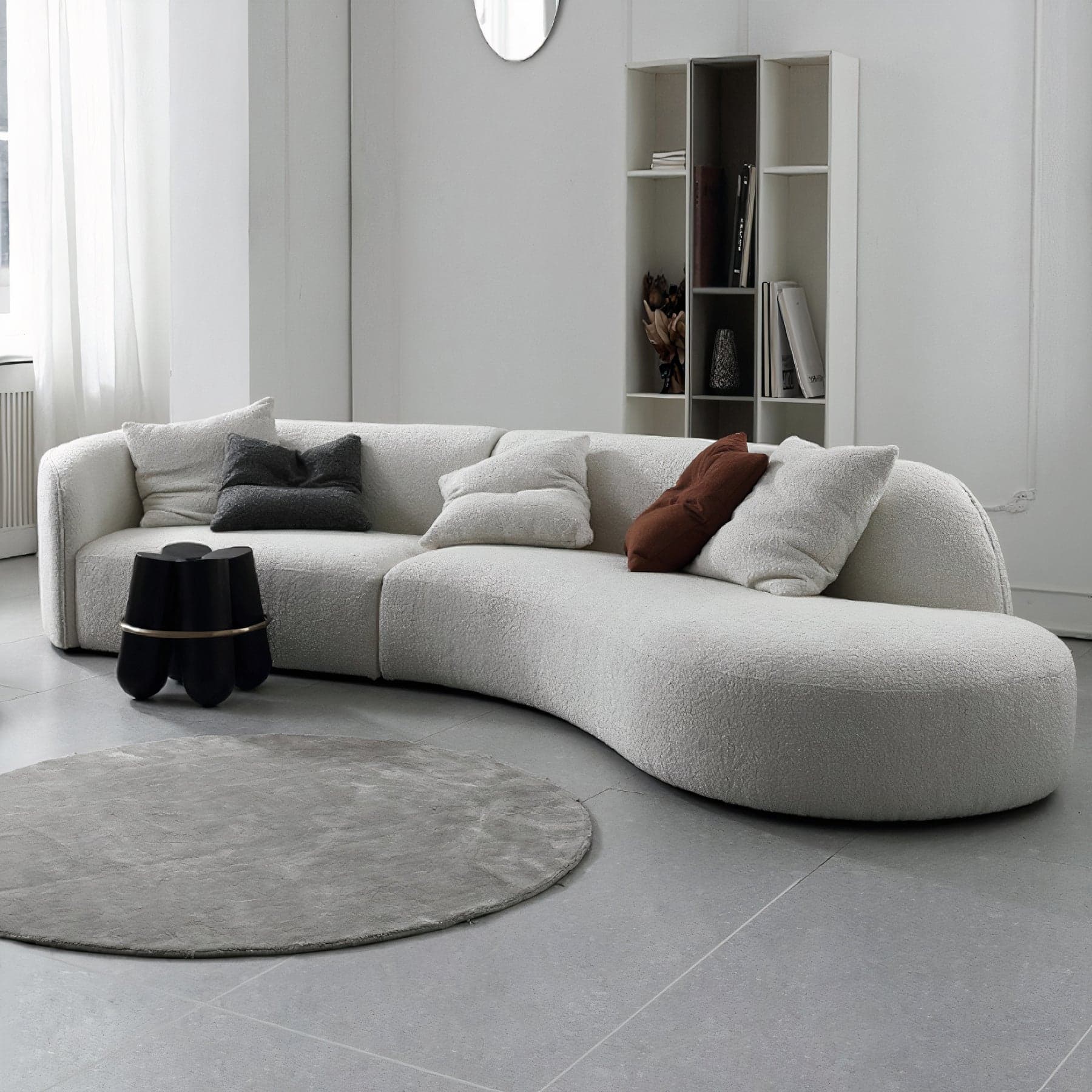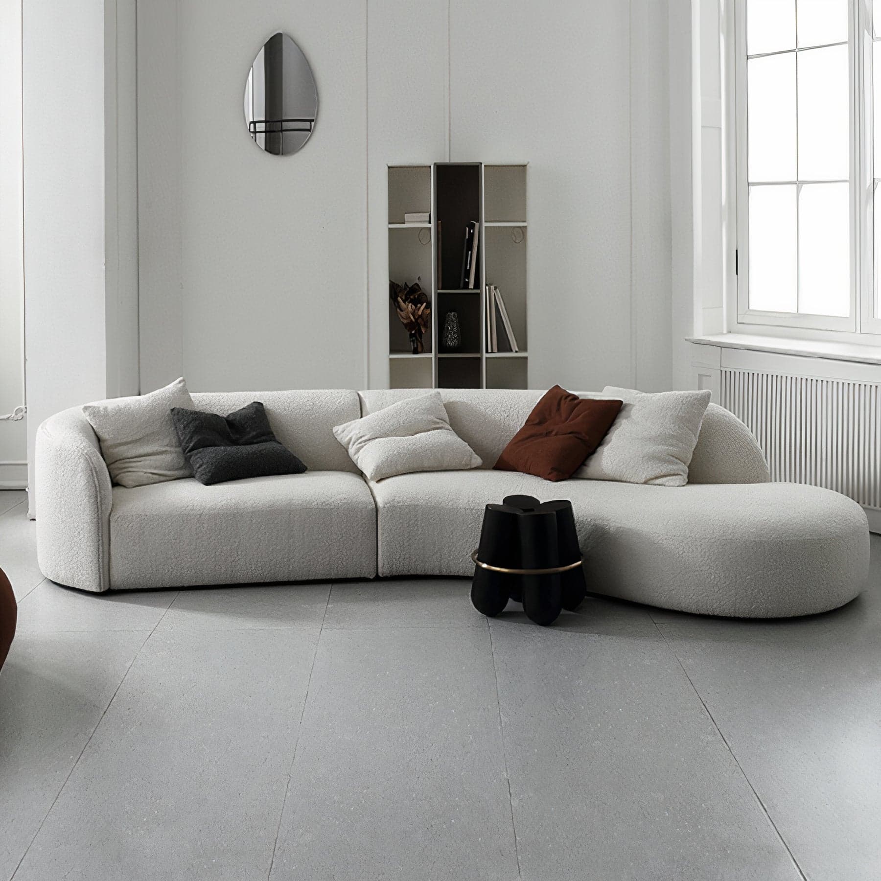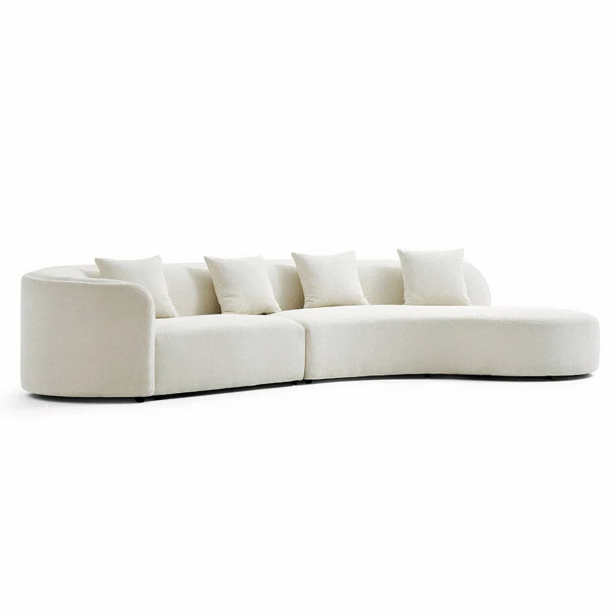 Embrace the softness and warmth of the Teddy Sofa, a piece that redefines the living space with its rounder, more organic silhouette compared to traditional sofas. Comprising two halves, one features a closed-rounded arm with a straight end side, while the other boasts an expansive open-end chaise, inviting relaxation and conversation. Available in both large and medium sizes, the large comfortably seats 6-7 people, while the medium accommodates 4-5, making it perfect for gatherings of any size. The sofa is dressed in a tight-weave cream white bouclé fabric that adds a tactile dimension to its aesthetic appeal. Whether you're lounging or entertaining, the Teddy Sofa offers a plush haven in any contemporary setting.