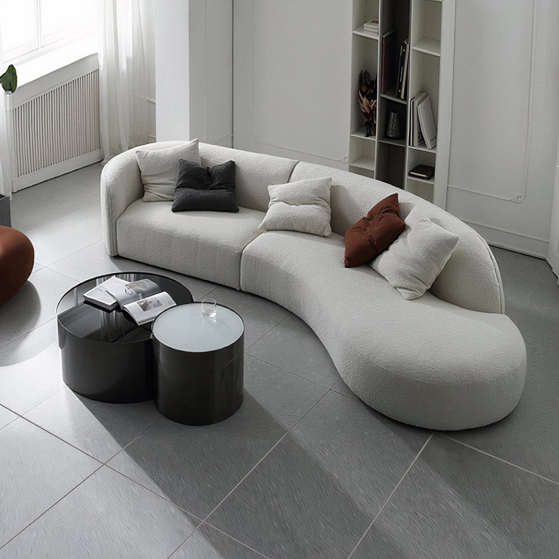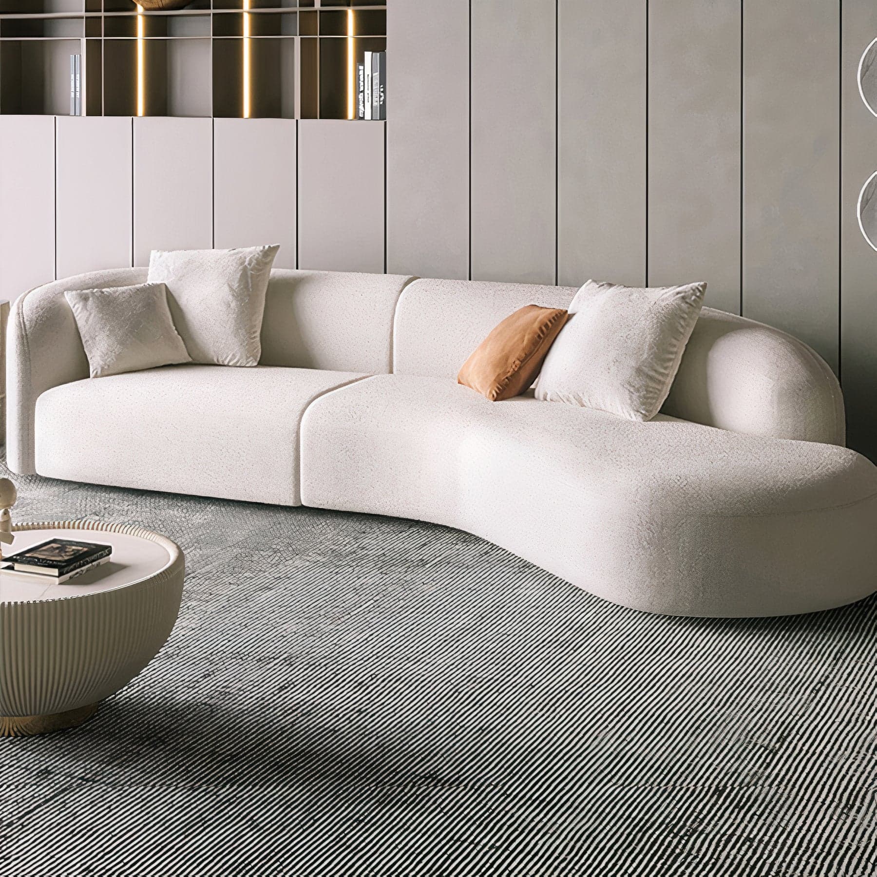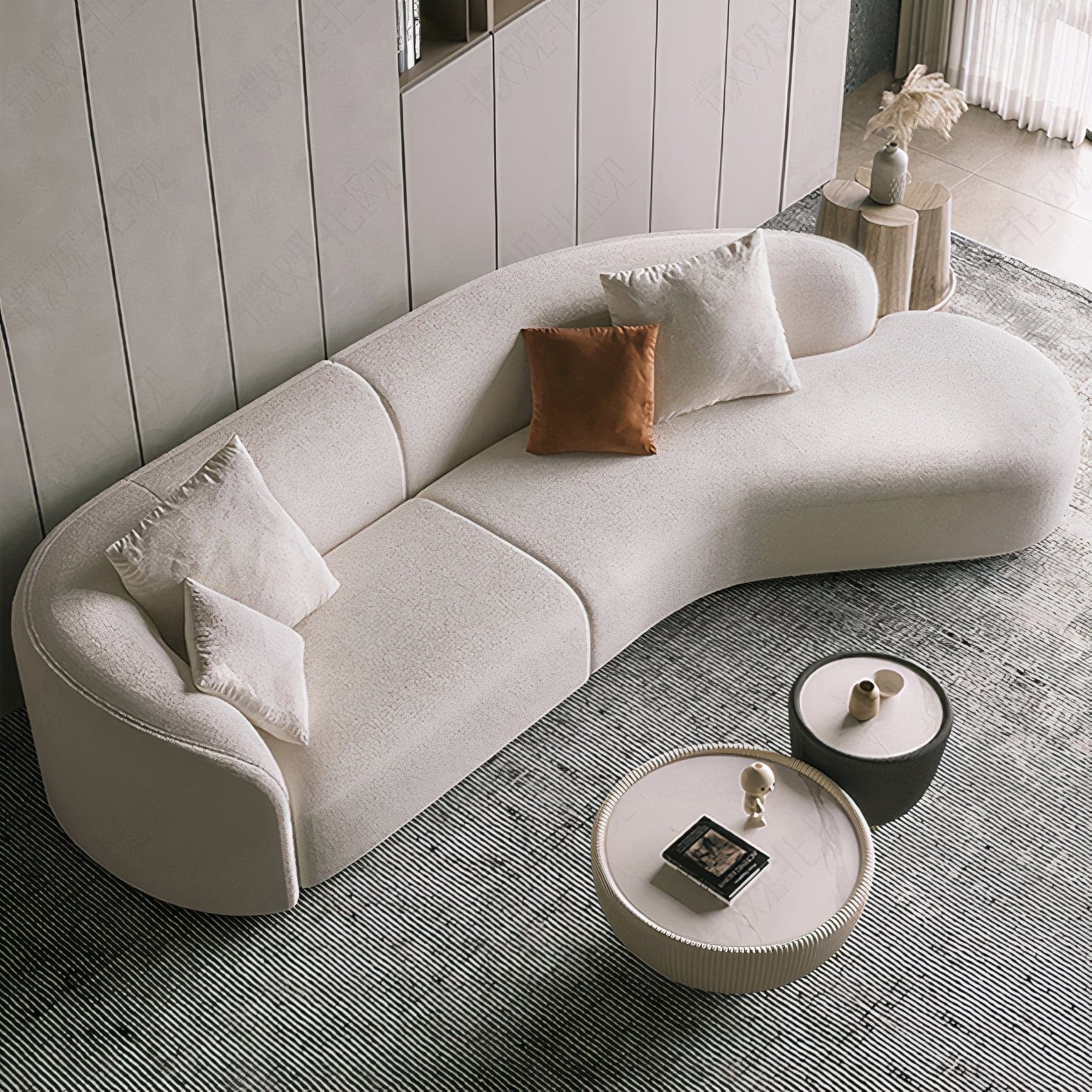 Embrace the softness and warmth of the Teddy Sofa, a piece that redefines the living space with its rounder, more organic silhouette compared to traditional sofas. Comprising two halves, one features a closed-rounded arm with a straight end side, while the other boasts an expansive open-end chaise, inviting relaxation and conversation. Available in both large and medium sizes, the large comfortably seats 6-7 people, while the medium accommodates 4-5, making it perfect for gatherings of any size. The sofa is dressed in a tight-weave cream white bouclé fabric that adds a tactile dimension to its aesthetic appeal. Whether you're lounging or entertaining, the Teddy Sofa offers a plush haven in any contemporary setting.