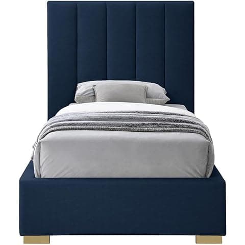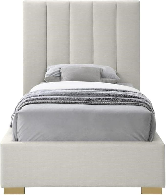 Give your bedroom a facelift with this linen textured bed. This twin-size bed features elegant beige linen textured upholstery that runs from its headboard, down its sides to its footboard, adding a sophisticated feel to your space. Deep channel tufting on the super tall headboard adds to its regal look, and it comes with both gold and chrome legs, so you can give it a personalized spin to match your décor preferences.