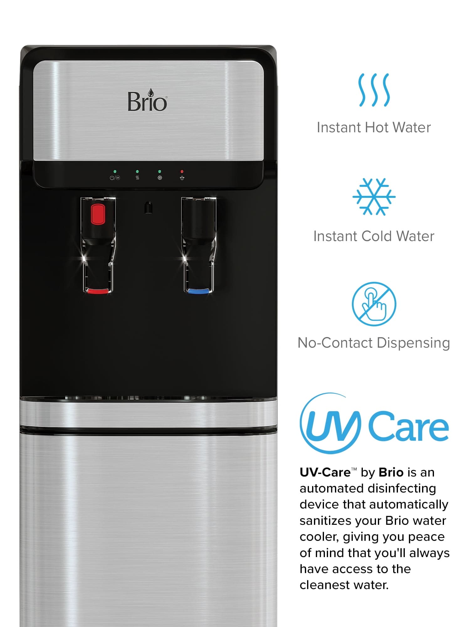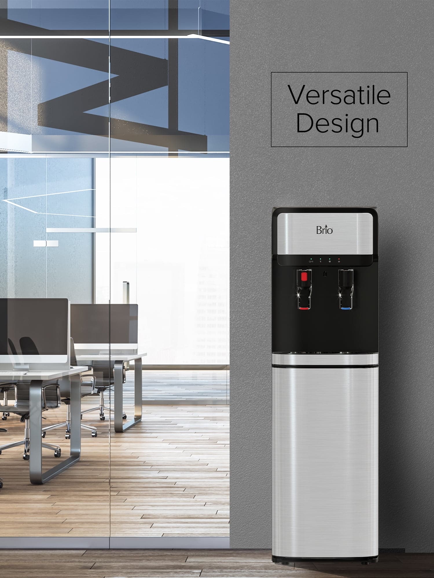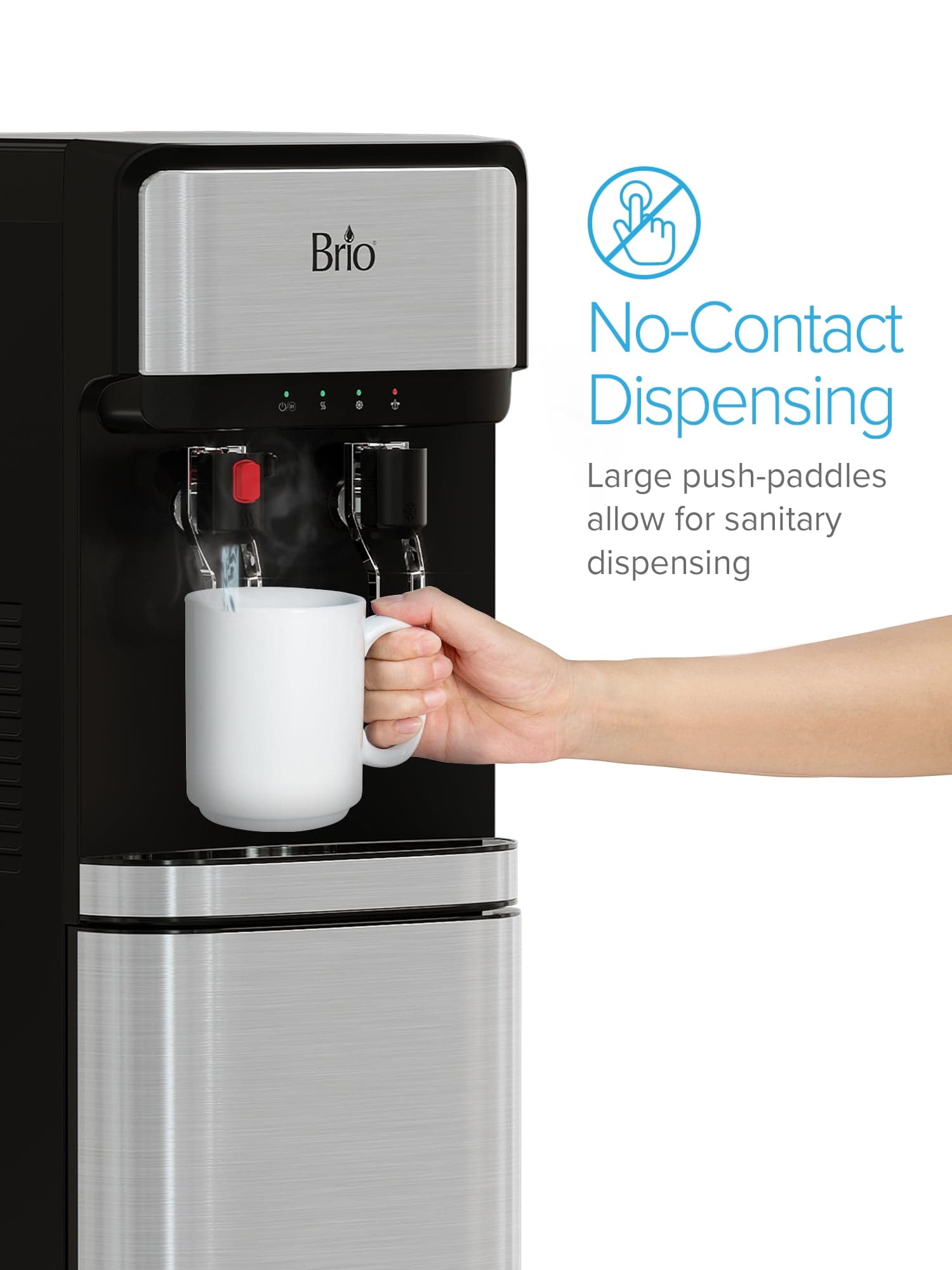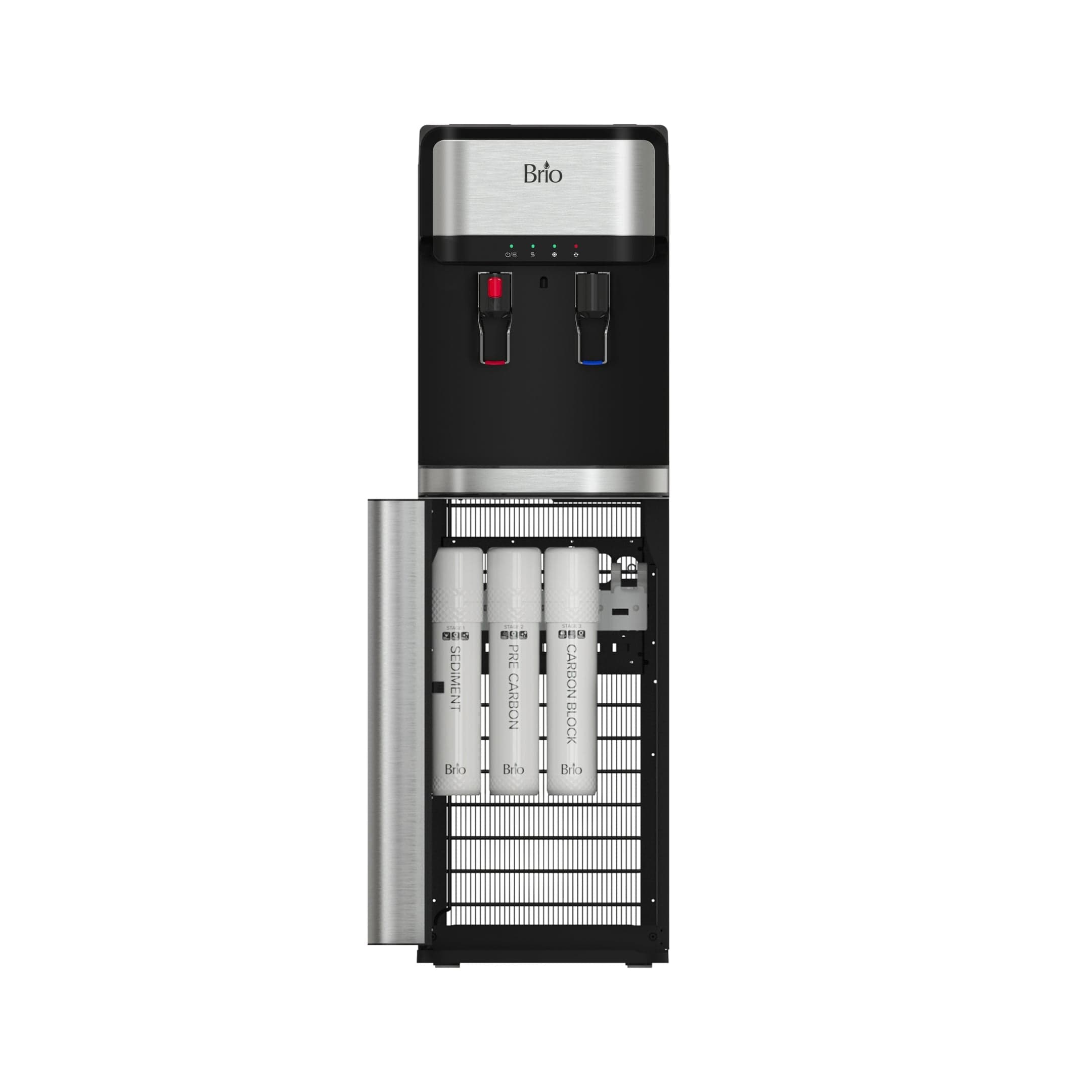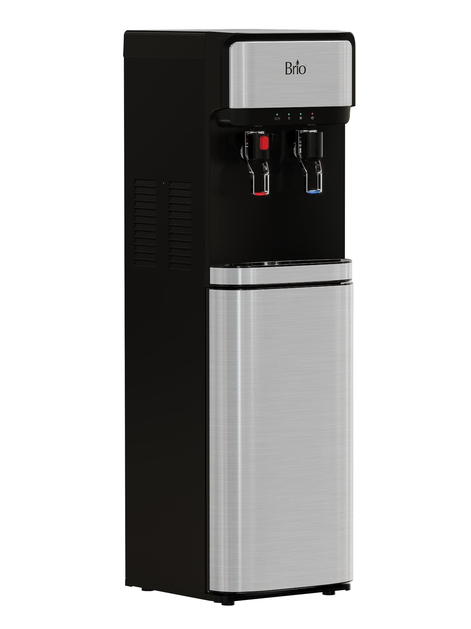 The Brio CLPOU320UVF3P Bottleless Water Dispenser with 3-Stage Filtration offers a quality hydration experience in every pour. This rugged cooler features both hot and cold dispensing options, and the three stages of filtration ensure water is always refreshingly clean and delicious. LED indicator lights notify you when filters are nearing expiration, when water is heating and cooling, and when self-cleaning is underway. Plus, the 2-step hot water dispensing keeps the whole family safe from accidental dispensing. The cooler also makes dispensing easy with the convenient no-contact paddles that are designed to minimize contact with containers, reducing the risk of cross-contamination. The cooler connects directly to a cold water line, freeing you from expensive bottle delivery services or endless purchases of single-use bottles of water. The automatic self-cleaning ultraviolet function cycles on and off automatically, so you don't have to do a thing. Count on the Brio Bottleless Water Dispenser with 3-Stage Filtration to bring sleek, modern style and on-demand filtered hydration to both homes and offices.