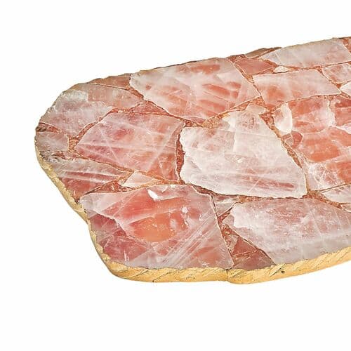 Crafted from solid rose quartz with raw organic gold trim, each board is unique in its dimensions, owing to the nature of the precious stone. Perfect for assembling an exquisite cheese and cracker platter. The natural beauty and superior craftsmanship of these one-of-a-kind boards set the stage for an elevated dining experience that will delight your guests.