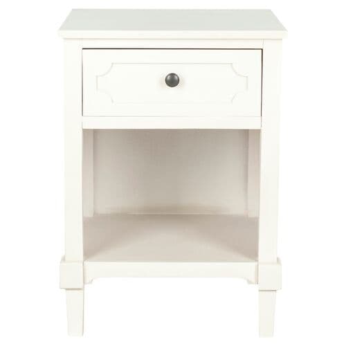 This rustic nightstand is handmade from solid pine with a distressed finish. The design features a sturdy drawer with a beveled trim front and a rustic iron hand pull, perfect for storing personal belongings. The lower shelf is ideal for storing small items, and the nightstand is skillfully handmade in Mexico.