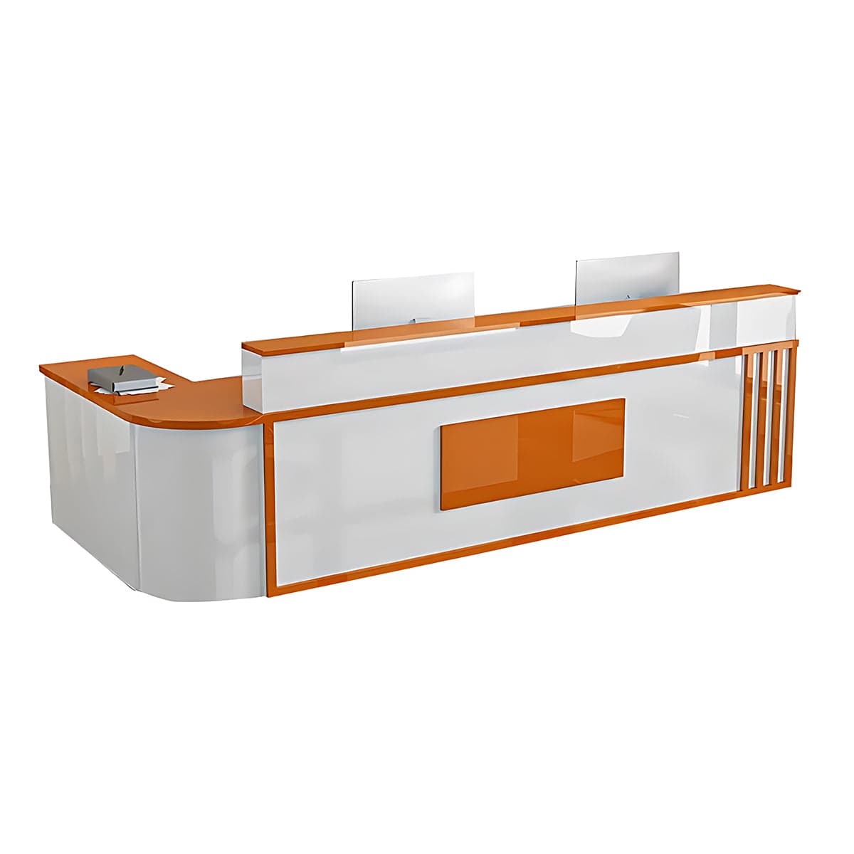 This modern and elegant reception desk is designed to enhance the professional atmosphere of any workspace. Made from E1-grade eco-friendly materials, it is scratch-resistant, fade-resistant, and odor-free, ensuring a clean and pleasant environment. Meeting international environmental standards, this desk provides a safe and sustainable option for businesses committed to eco-conscious practices. The desk features a durable middle partition that offers excellent load-bearing support, adding both stability and functionality. This partition helps organize office items efficiently, contributing to a more organized and tidy reception area, perfect for handling high traffic in commercial environments. A high-quality glossy lacquer finish gives this desk its sleek and polished appearance. The finish is heat-resistant, colorfast, and low in formaldehyde, ensuring that the desk maintains its beauty and durability over time, even in busy settings. It combines aesthetic appeal with long-lasting performance, making it ideal for high-end workplaces. Perfect for upscale offices, hotels, large corporations, or law firms, this reception desk brings sophistication and organization to any space.