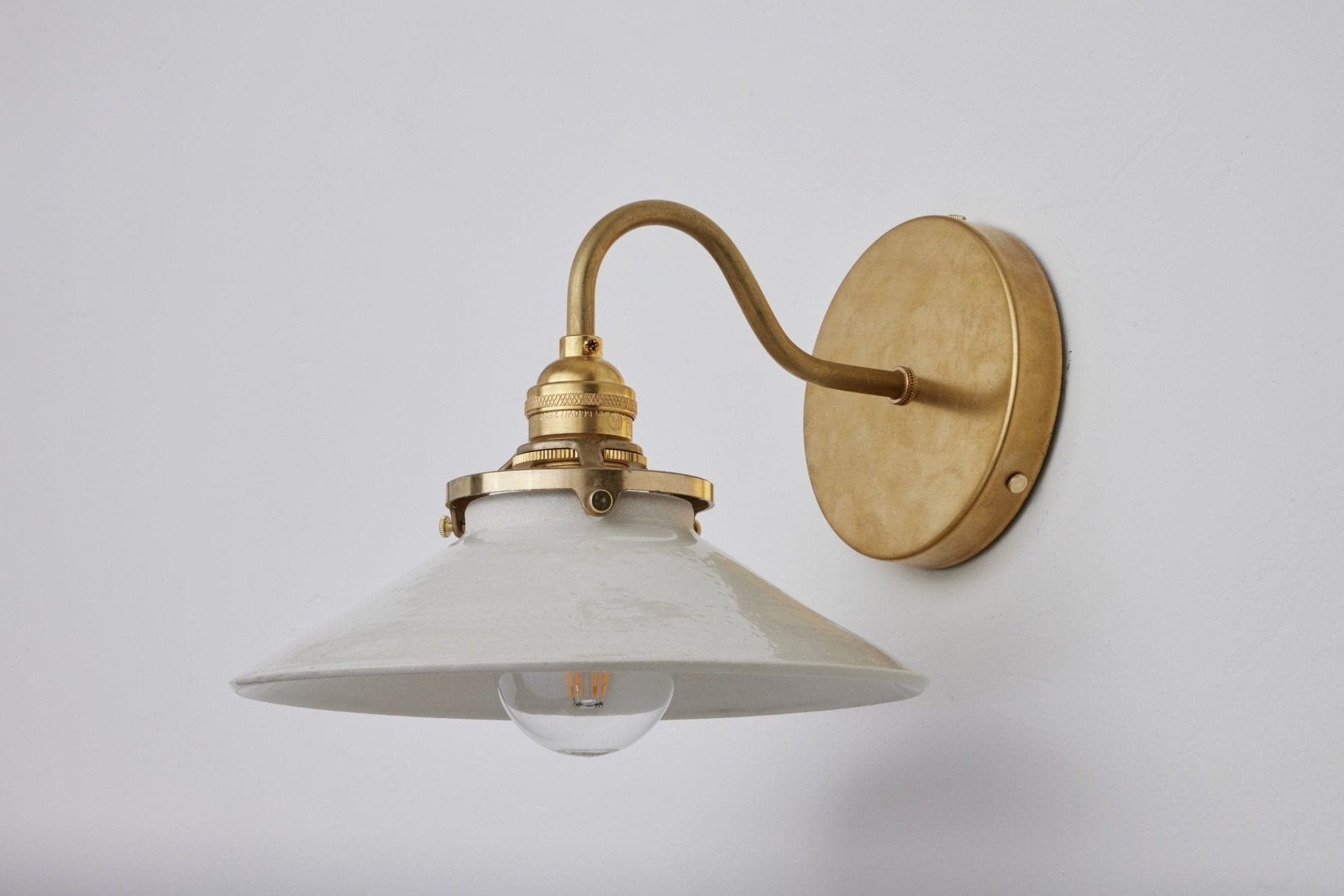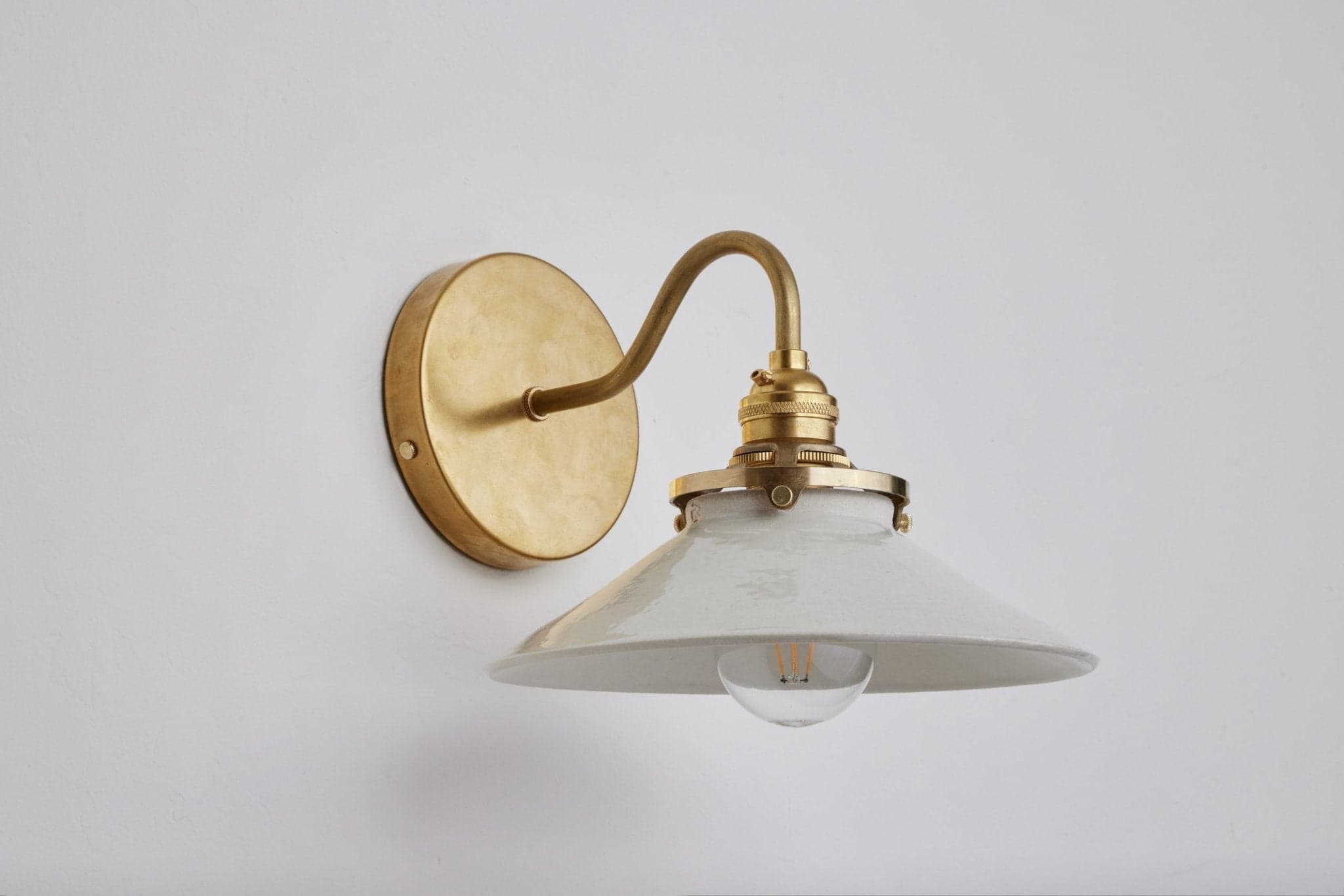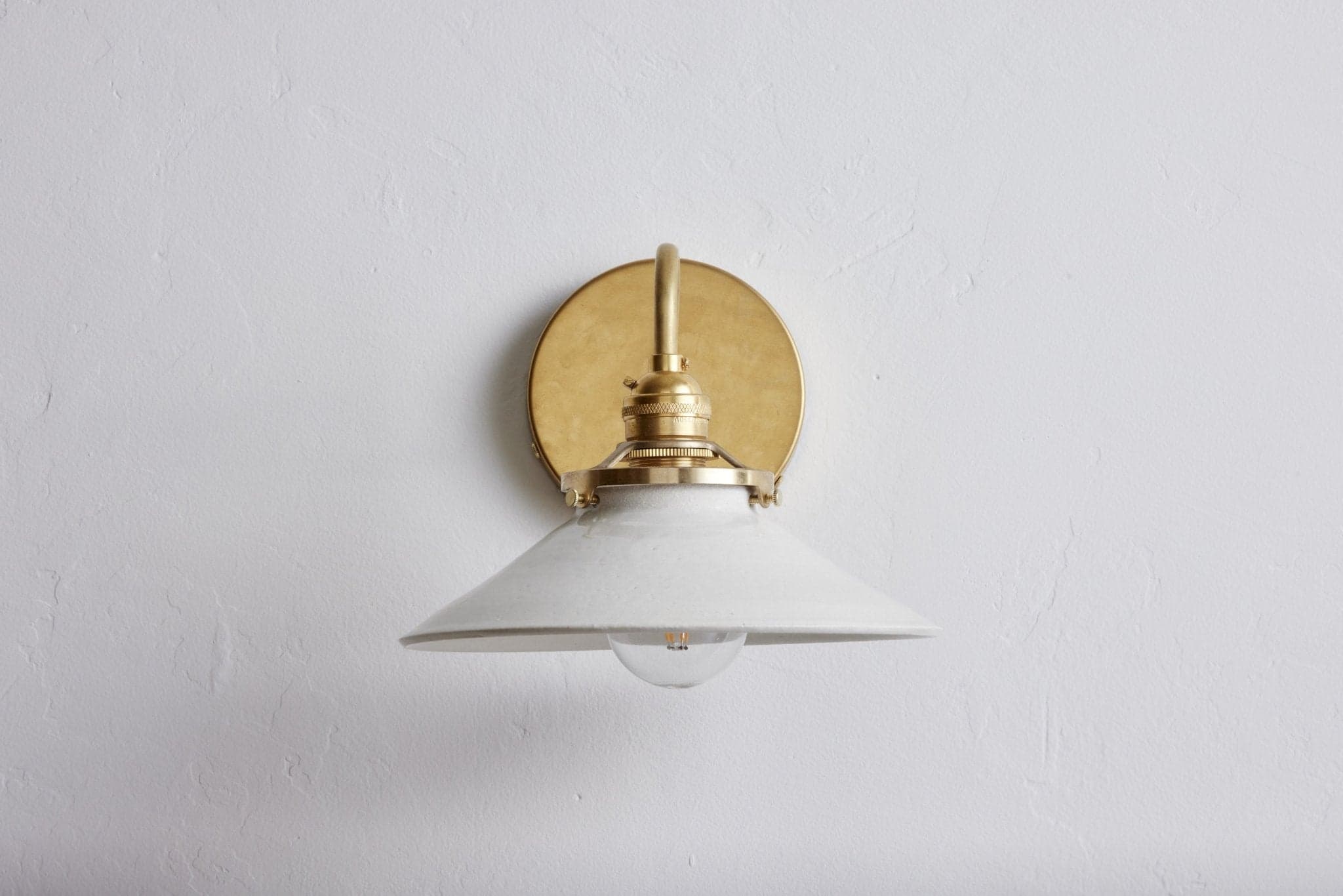 9" Peak Sconce from Tucson based ceramicist, Stephen Abate. Brass hardware and flushmount canopy compliment subtle glazing on milky white clay. Perfect at the vanity, entry hallway, or really anywhere asking for an elevated touch. Dimensions: ~9" D Clearance from wall: ~10" Back plate: ~5" Bulb: E26 — not included. Handmade in Tucson.