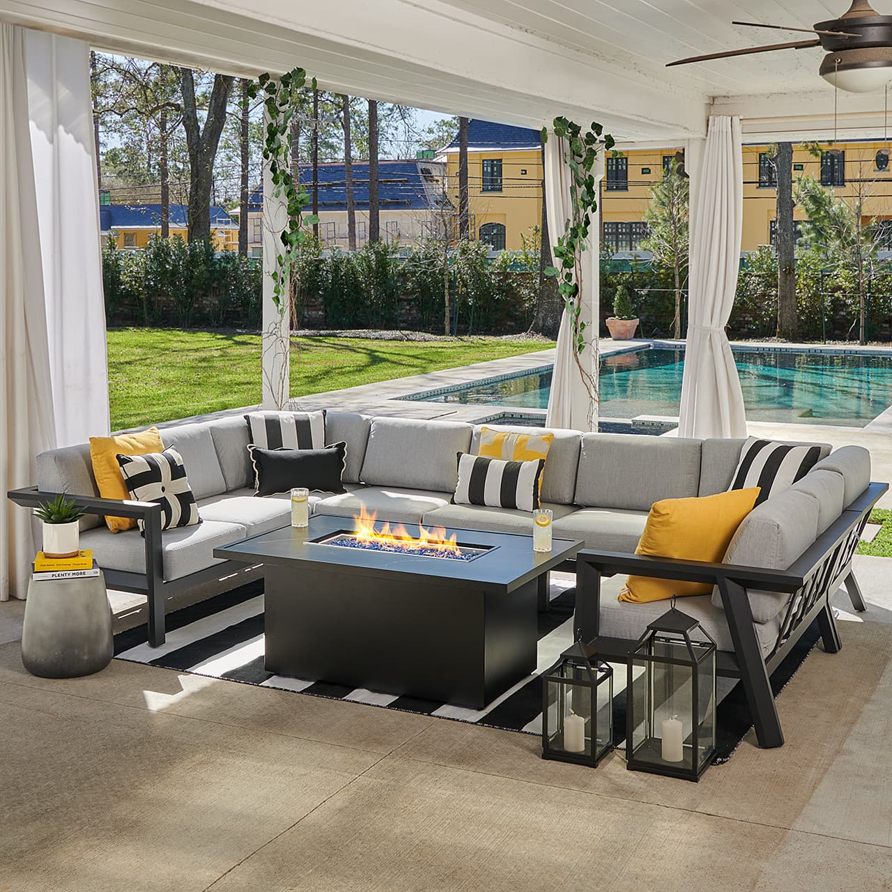 The St. Lucia Collection is a bold and contemporary outdoor seating set that will provide you with the perfect backyard patio experience. Each piece in this 8 piece sectional with a fire pit has a handmade aluminum frame with a durable multi-step powder-coated and oven-baked clear coat finish. Each sectional piece is built by laser welding to create fully welded and braced frames with zero weld marks. The seat cushions feature a firm yet plush foam core wrapped in polyester for extra comfort, while the back cushions are layered with polyester to retain their shape while still providing comfort.Stay comfortable no matter the temperature outside with this 52 x 32 in. rectangular sintered stone table top fire pit. The seamless stone top will impress and add a unique flair to your seating group, even on the coolest nights. Included is a fire pit lid to cover your fire pit when not in use.What's Included: 1