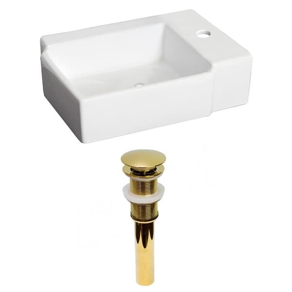 This vessel set features a rectangle shape with a transitional style. This product is made for wall mount installation. DIY installation instructions are included in the box. This vessel set is designed for a 1 hole faucet and the faucet drilling location is on the right. This vessel set features 1 sink made with ceramic. The primary color of this product is white and it comes with gold hardware. Smooth non-porous surface; prevents from discoloration and fading. Double fired and glazed for durability and stain resistance. 1.75-in. standard USA-Canada drain opening. Constructed with lead-free brass, ensuring strength and durability. Solid bulky brass feel (not cheap and light).