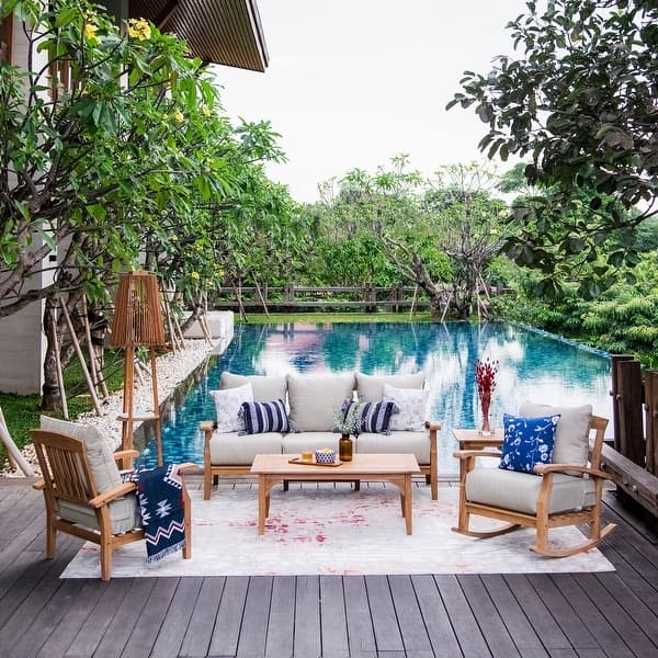 Experience ultimate relaxation with the Leon 5-Piece Teak Outdoor Conversation Set, perfect for summer gatherings by the poolside, pergola, or gazebo. Crafted from durable Indonesian teak, this patio conversation set blends comfort and durability, featuring lounge chairs, rocking chairs, and sofa that invite you to unwind. Ideal for enjoying serene moments by the firepit, this teak conversation set transforms your outdoor space into a luxurious retreat.