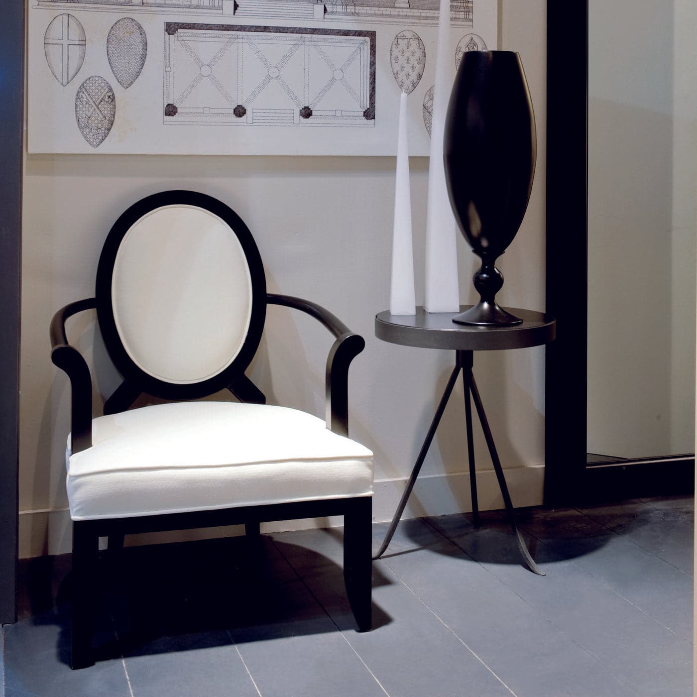 This handcrafted chair features a retro design with its oval-shaped back and black lacquered finish over the wood structure. The elegant linen blend upholstery covering the seat and back cushions adds a sophisticated accent to any contemporary living room.
