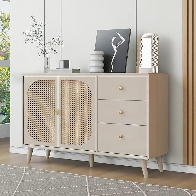 High-quality materials: strong and durable, suitable for everyday use. Certified E1 chipboard keeps you away from chemical odours. The thicker version of the plate is matched to solid pine legs, which significantly increases the stability of the product and the well-assembled cabinet does not wobble. All surfaces are waterproof and easy to clean. More storage space: the sideboard consists of 2 wooden doors and 3 drawers. So memory is provided! 2 wooden doors and 3 drawers provide plenty of space for storing crockery, chests and more. Natural minimalist aesthetics: rattan fabric door trim, beautiful and stylish, prevents dust penetration and facilitates daily cleaning. This chest of drawers should not be missing in any home. Durable and expressive wood in soft offwhite creates a cozy and warm living room. 45 degrees: the corners are split at 45 degrees, so that the cream cabinet is matched with woven PE rattan, which improves the shape and design of the product. No hinges: the door panels are designed to be very easy to assemble and at the same time reduce noise. Just pull it easily, the easy-to-open wooden door design and smooth sliding rail drawer save time and effort, and there is a magnetic adsorption when the wooden door is closed. Multi-purpose: this dresser can be used as a chest of drawers in the kitchen, bookcase, TV stand, storage cabinet or as a presentation rack in the living room. Easy to install: thanks to the detailed instructions (English language not guaranteed), the wooden chest of drawers can be set up quickly and easily and is therefore also suitable for beginners. Installation material included. Dimensions: 120 x 82.5 x 40 cm (W x H x D).