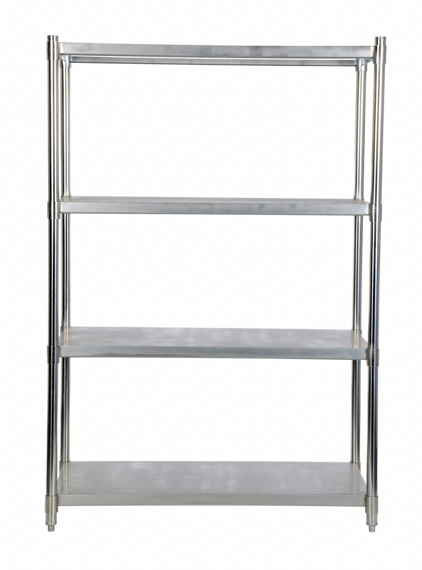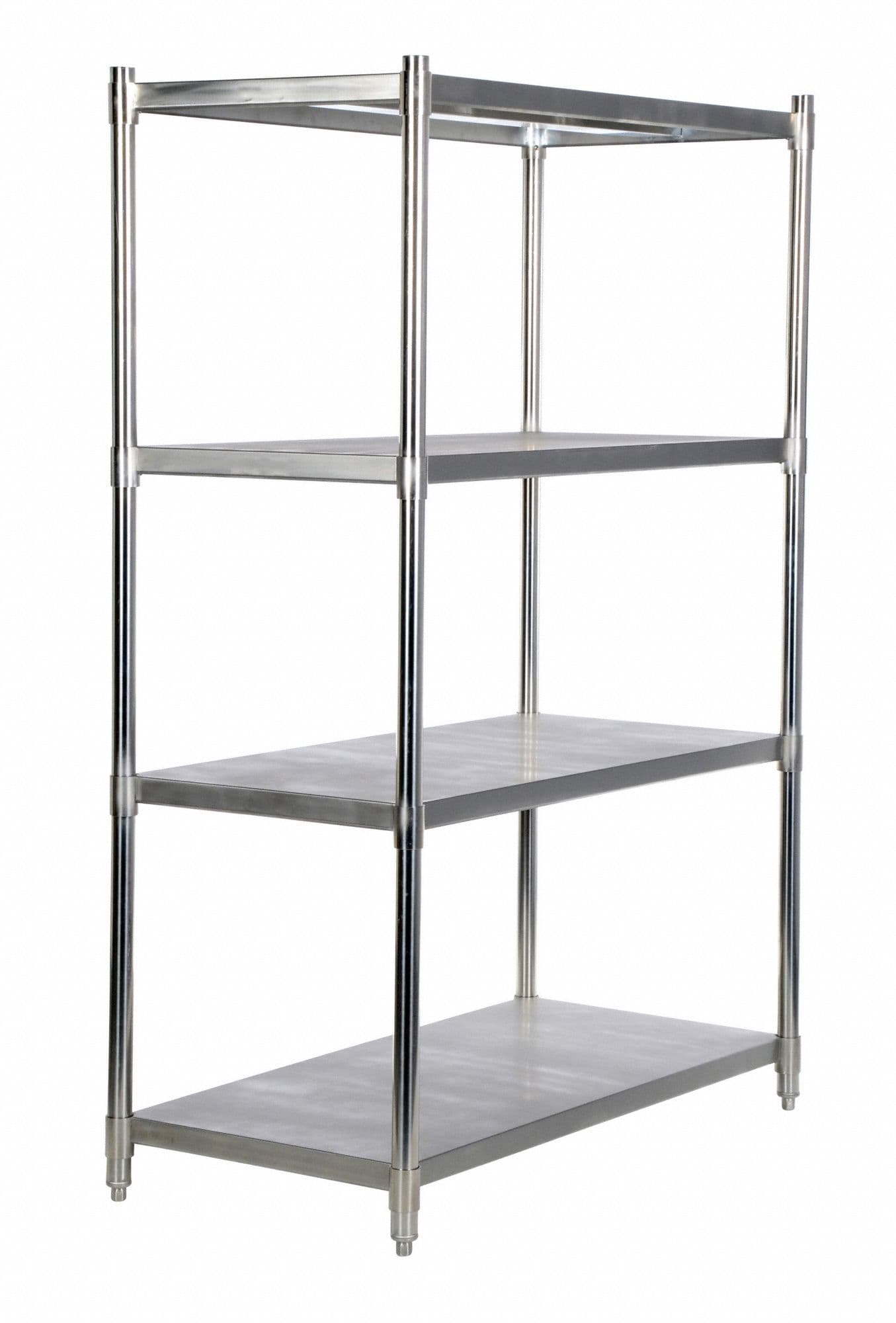 Stainless steel corrosion-resistant open metal shelving units hold moderately heavy items and resist rusting when used in damp or wet environments. These shelving units consist of shelves and posts. The shelves slide onto the posts and are secured in place with set screws.