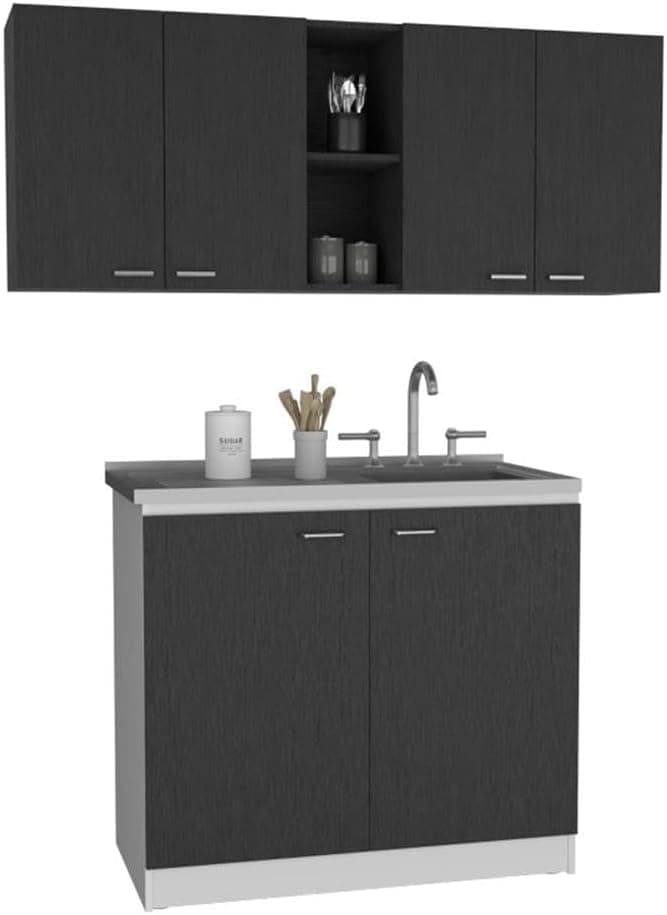 Introducing the Luther 2 Piece Kitchen Set - a stylish addition to your home. Elevate your kitchen's storage and functionality with this versatile set. The set boasts a sleek black and white design crafted from durable engineered wood. It includes a practical wall cabinet, easy to assemble and mount in your kitchen and a spacious utility sink cabinet for your convenience. This easy-to-assemble Olimpo 150 Wall Cabinet is designed to be mounted to your wall. It features two double-door cabinets with handles, providing ample storage space for your kitchen essentials. Additionally, the cabinet includes two open shelves in the center for displaying your favorite dishes or decor. The internal storage offers even more space to keep your kitchen organized. With its sleek design and practical features, the Olimpo 150 Wall Cabinet is the perfect choice for any kitchen. With its durable construction and practical design, the Salento Utility Sink with Cabinet is the perfect choice for any kitchen, laundry room, or garage. This sink and cabinet feature a stainless steel top and a two-door cabinet with handles for easy access. The cabinet offers ample internal storage space to organize your cleaning supplies and other household essentials. Please note that the faucet is not included in this unit.