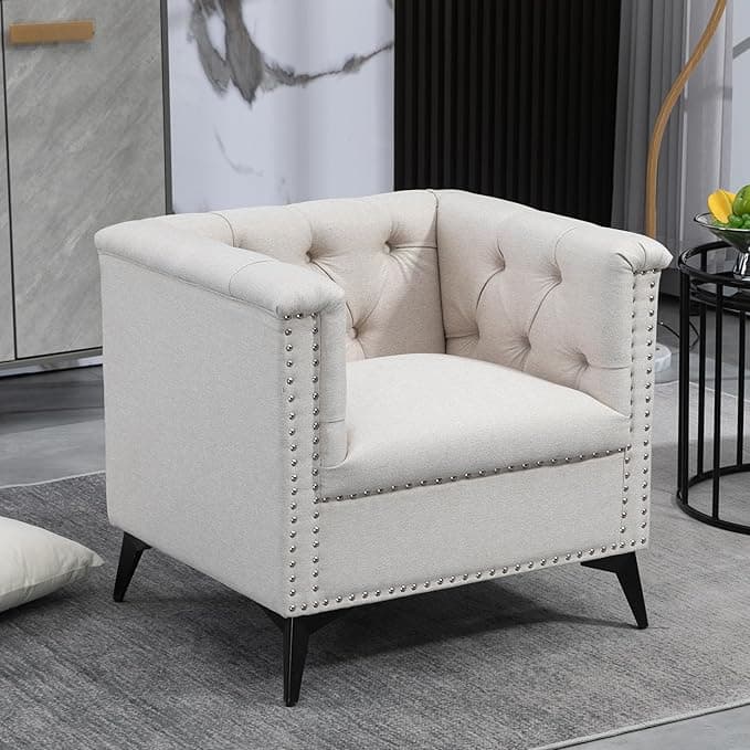 Cesgyfut Sofá de lectura de lino con brazo, sillas individuales modernas con decoración de botones, sillón con ribete de clavos para sala de estar, dormitorio, sala de espera, beige