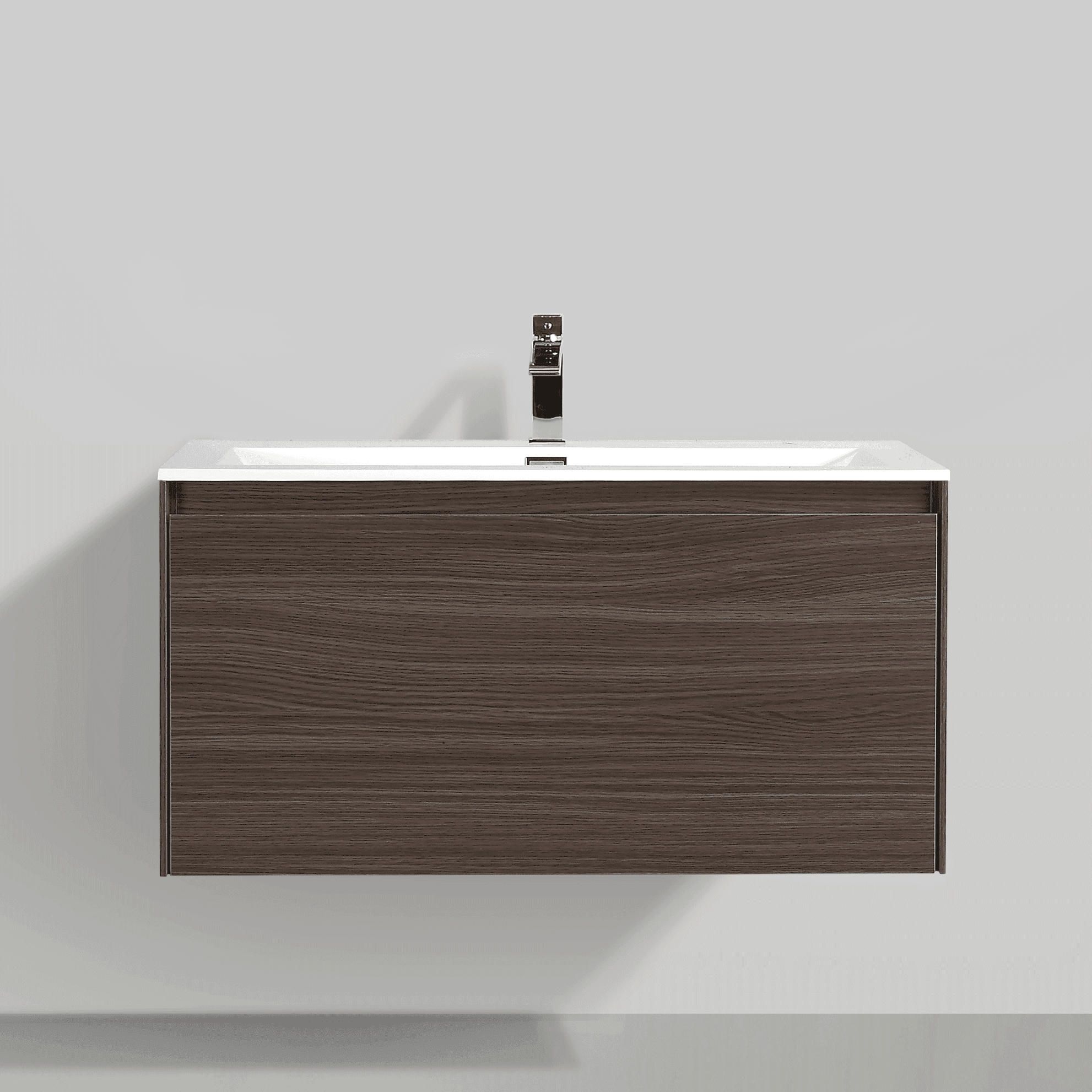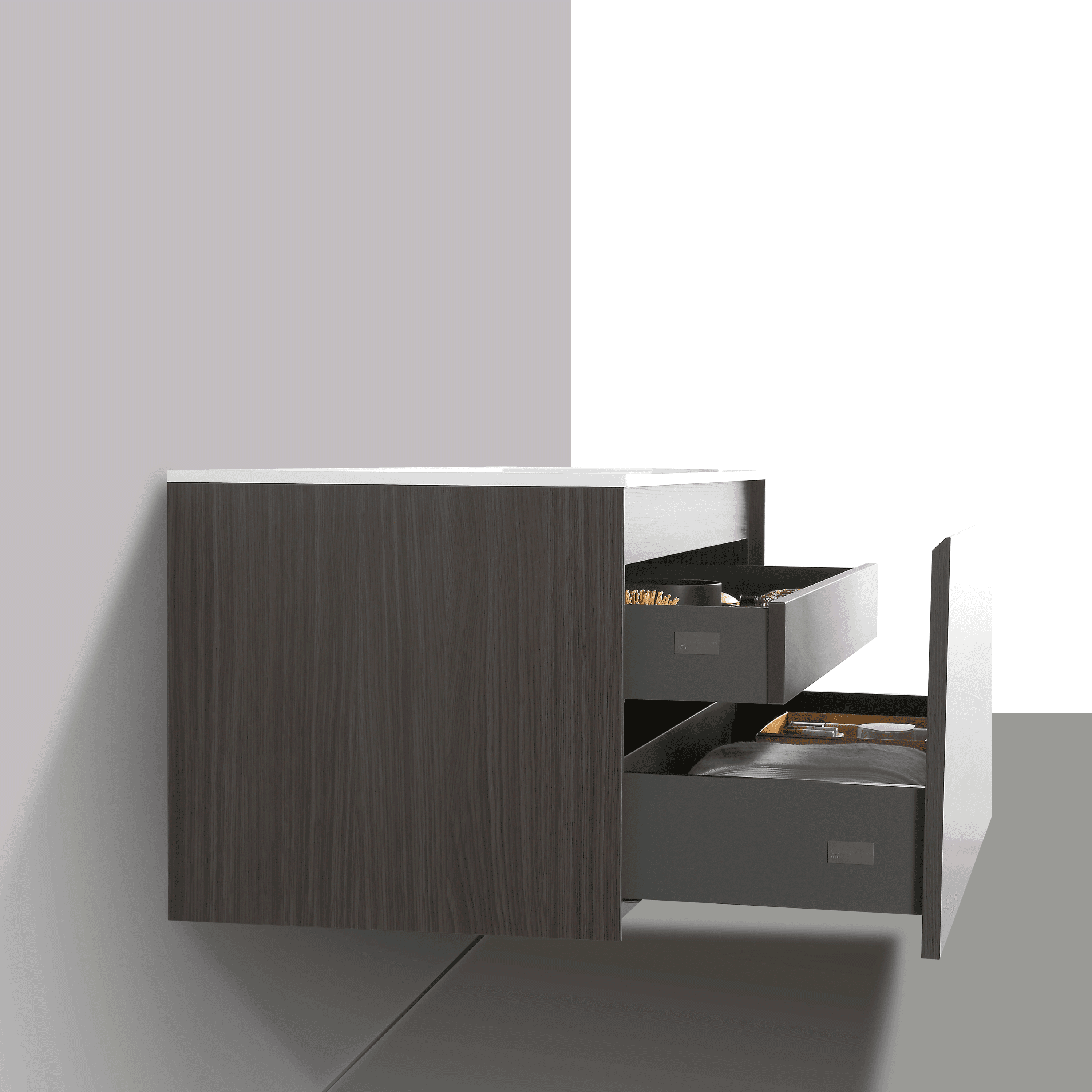 Contemporary 36-inch concealed double drawer wall hung floating bathroom cabinet in a graphite wood finish. Single bowl white acrylic sink. The vanity provides a beautiful addition to your bathroom with a clean modern look.