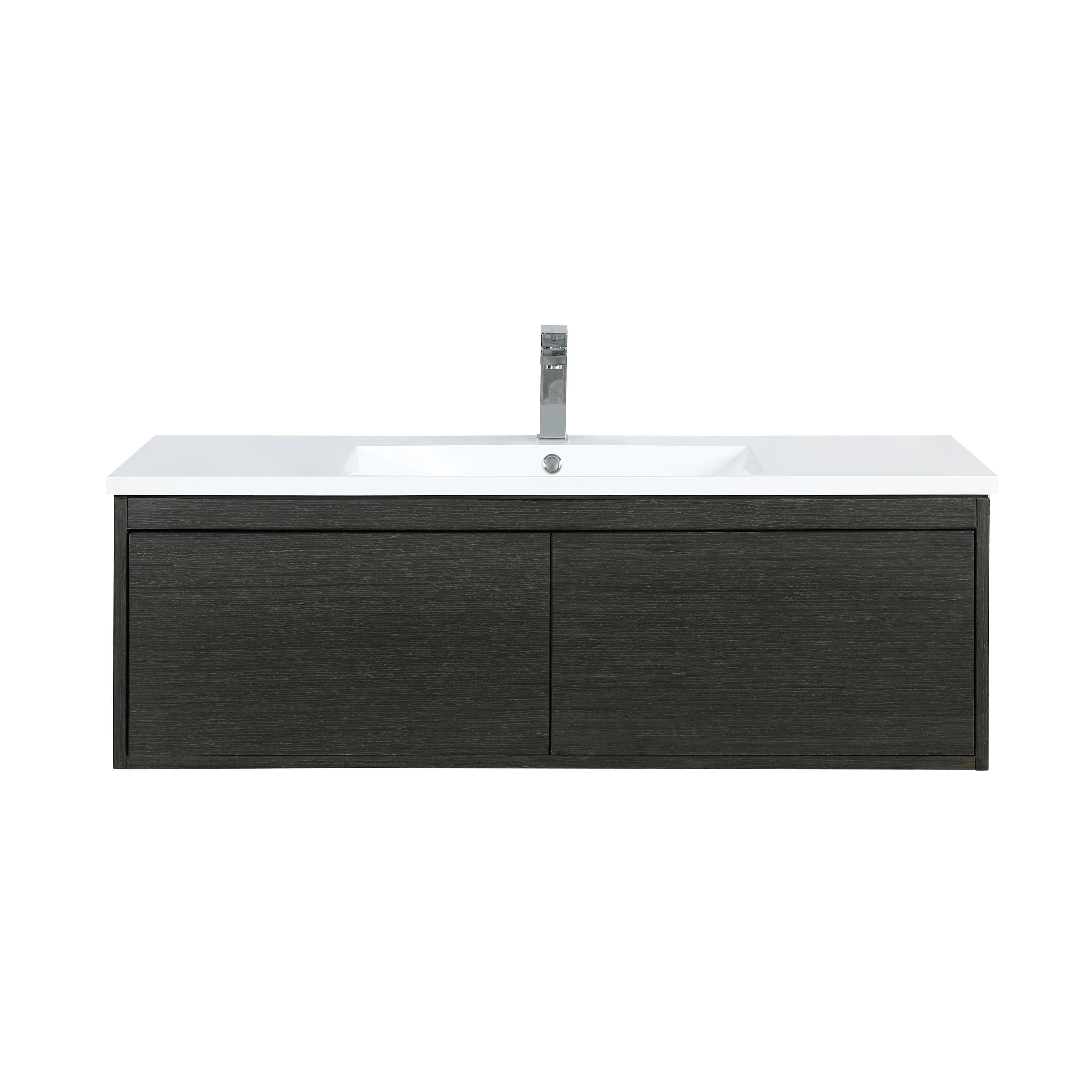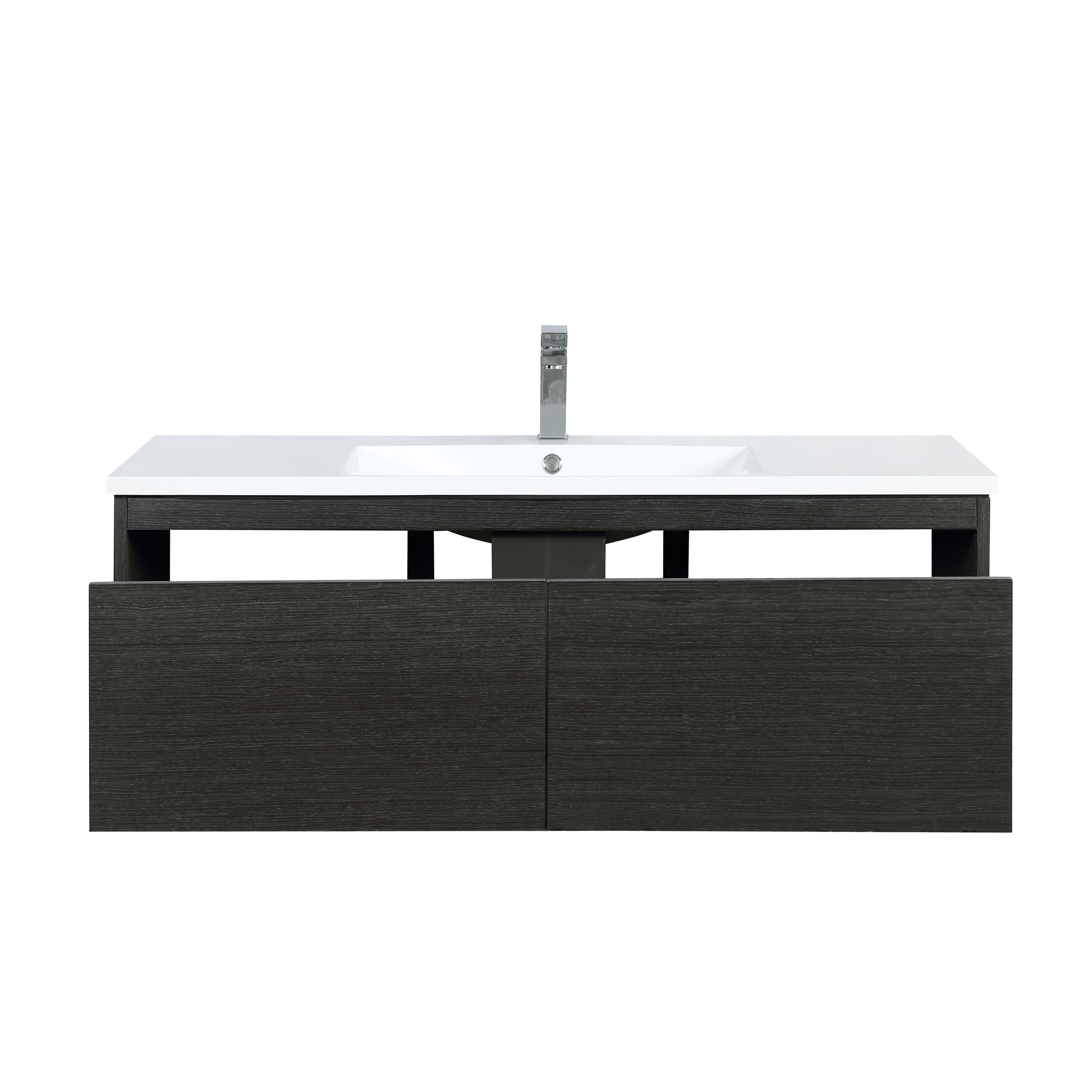 Infuse your bathroom with a calming sense of harmony. The Sant collection blends bold, natural iron charcoal wood grain with stylish vibrant white accents. Simplicity lines each element through form and functionality. Despite its minimalist contours, each panel is polished to perfection through our extensive detailing process. Easily accessible and beautifully crafted, ample storage space remains tucked underneath, ensuring all your necessities are with arm's reach. Brilliant design and a streamlined profile lend a balanced ambience to your bathroom.