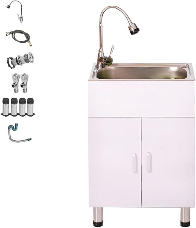 ✭ Our products include: 6.7in deep sink, large-capacity storage cabinet (requires installation), faucet, silent hinge, handle, drain basket, S-shaped anti-odor drain pipe, angle valve, and adjustable support legs. ✭ Do you want to remodel your laundry room? This integrated cabinet laundry sink is a good choice for you. It's perfect for use in utility rooms, kitchens, garages, basements, RVs and or small spaces. ✭ The cabinet under the sink also has ample storage space where you can store laundry detergent, soap, and other items. ✭ Adjustable legs adapt to uneven floors and provide stable support; the gooseneck faucet can rotate 360°Toggle left or right to adjust water temperature. ✭ Our laundry room sinks feature a drain basket that effectively captures debris and prevents clogs, making waste disposal a breeze; and an S-shaped trap traps odors to prevent them from escaping into your workspace.
