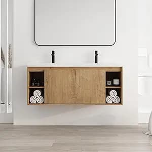48inch Bathroom Vanity with Double Sink, Bathroom Vanity Set with ceramic sink basin top & 2 Soft Doors Cabinet & mid storage shelves, Excluding faucets. This elegant wall-mounted vanity is compact in size and ideal for any Bathroom or Powder Room. Two full-extension doors provide easy-access storage for all your toiletries. Great quality, durable ceramic sink with a glossy white finish that is resistant to water for everlasting performance. The white ceramic sink is predrilled, allowing you to choose a faucet that suits your needs and style. Features a sleek overflow hole. Prevents water leaks and spills without spoiling its elegance. The basin has unique modelling, bringing different feeling to your bathroom.