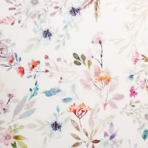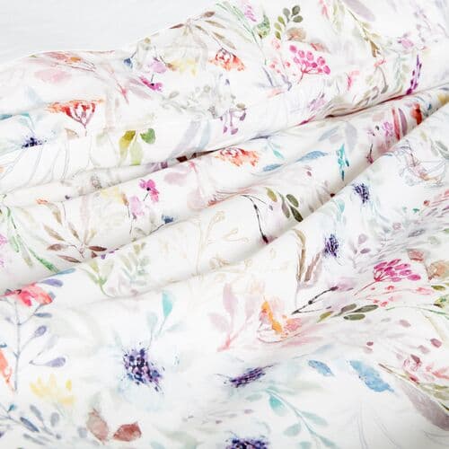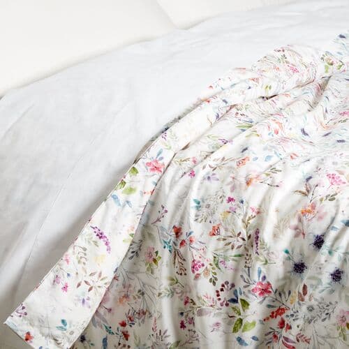 An enchanting wildflower print lends bright splashes of color and fanciful allure to this luxe cotton percale duvet cover. The duvet's edges are beautifully accented by an overlock-stitch detail in platinum thread.