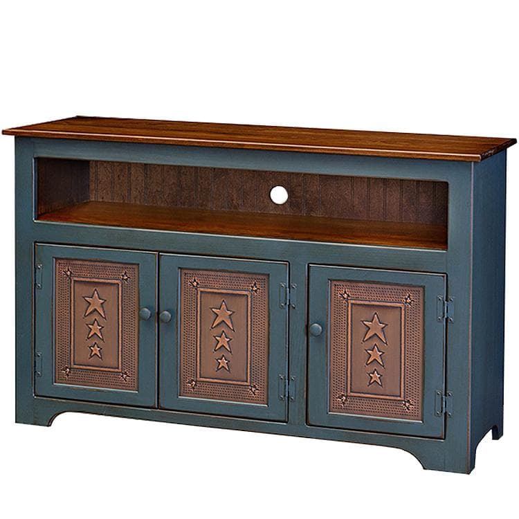 Crafted in the USA, the Country TV Stand with Tin Panels enhances any family room or TV space. It features a deep recessed console opening and a shelf behind each cabinet door, providing ample storage for media equipment. The Country Blue and Cherry finish pairs well with the copper patina of the embossed tin panels. Offered in two sizes, this durable TV stand complements home decor. Made from white pine and maple, each piece in the Country Accents Furniture Collection is built to last by American craftsmen. Influenced by early American and Amish designs, the furniture line is finished with two coats of polyurethane for long-lasting durability. Available in 3 or 4 door configurations.